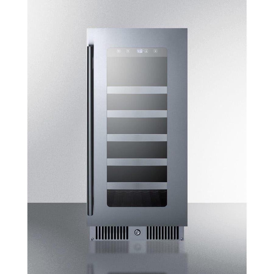 Summit Wine Cellar, reach-in, one-section, built-in or freestanding, 14.88″W x 23.38″D x 34″H, (29) bottle capacity, single temperature zone, 41°F to 68°F temperature range, (1) glass hinged stainless steel framed door, LED interior lighting, (5) wood shelves with stainless steel trim, automatic defrost, digital thermostat, fan-forced cooling, black cabinet exterior and (2) leveling feet.