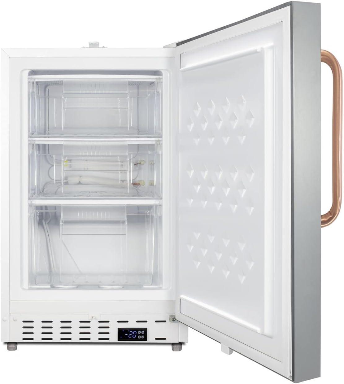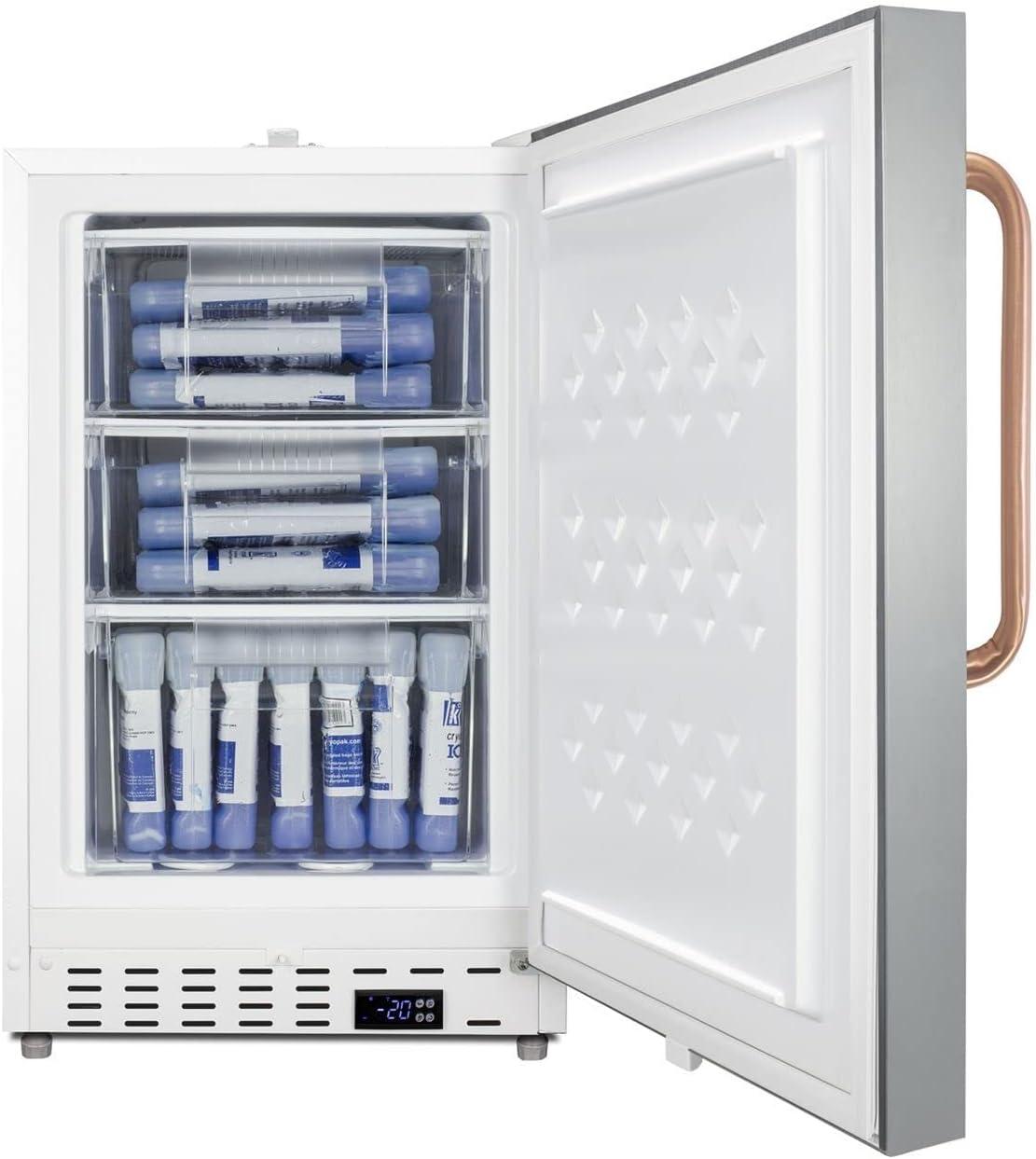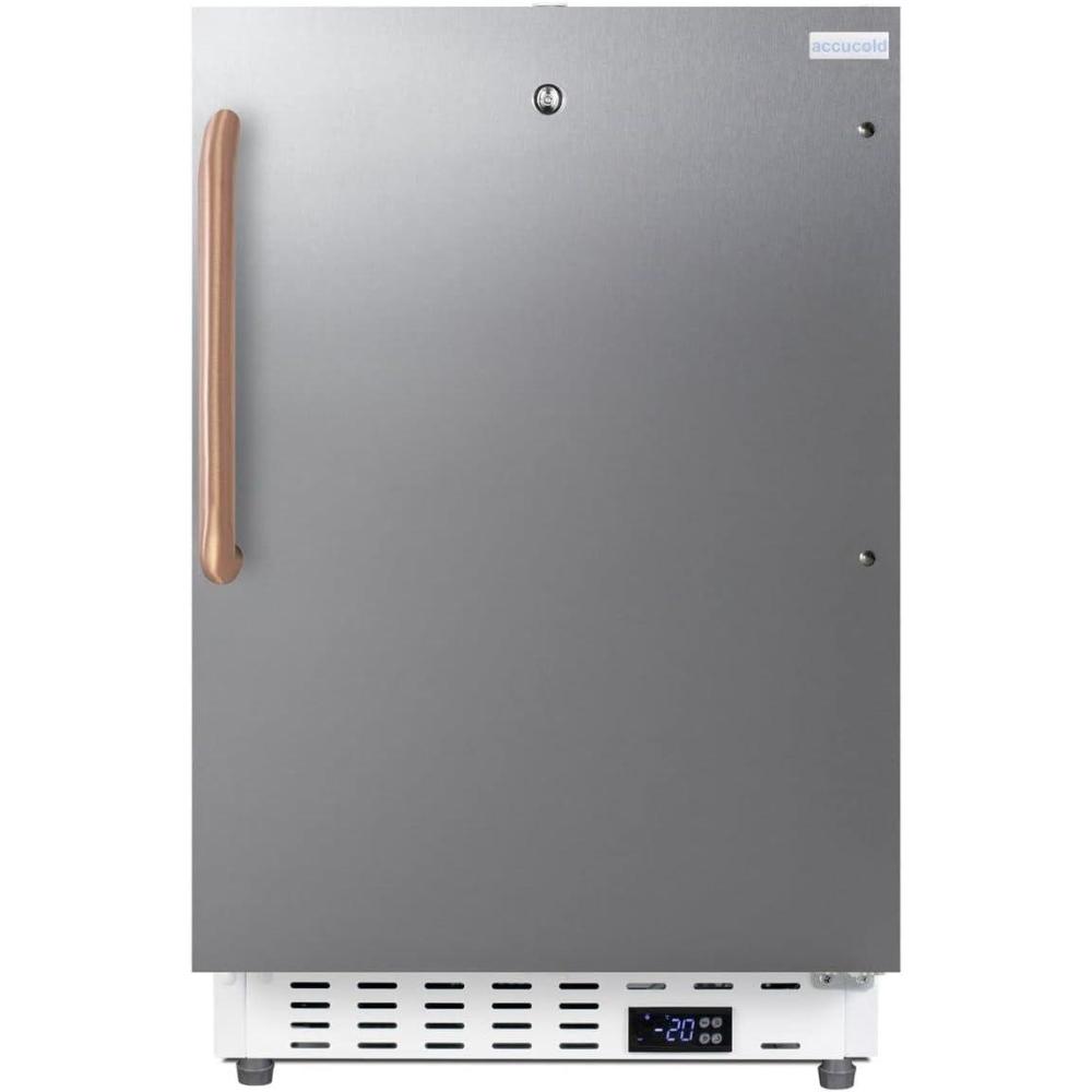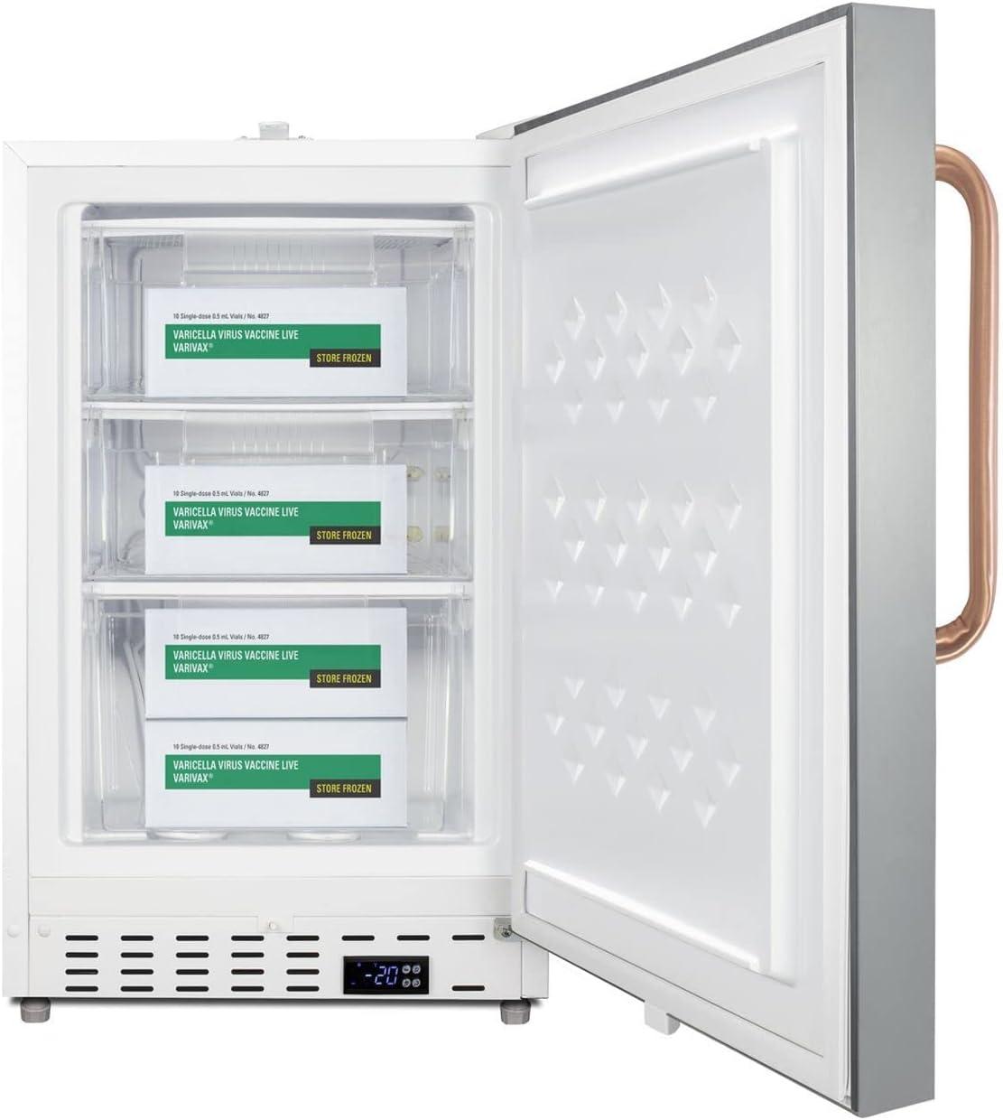 Accucold 20″ Wide Built-In Vaccine All-Freezer, with Stainless Steel Door, Copper Handle, and Lock; Adjustable Digital Thermostat; Open Door Alarm; 100% CFC Free Key Features: – Built-in capable – Factory-installed lock – Adjustable digital thermostat – 3″ thick door – Open door alarm – Manual defrost – No internal fans – Sealed back – Matching all-refrigerator – 100% CFC free Product Specifications: – Height of Cabinet: 31.75″ (81 cm) – Height to Hinge Cap: 32.0″ (81 cm) – Width: 19.75″ (50 cm) – Width with Door Open: 20.25″ (51 cm) – Depth: 22.5″ (57 cm) – Depth with Handle: 25.0″ (64 cm) – Depth with door at 90°: 40.25″ (102 cm) – Capacity: 2.47 cu.ft. (70 L) – Defrost Type: Manual – Door: Stainless Steel – Cabinet: White – Amps: 1.1 – Voltage/Frequency: 115 V AC/60 Hz – Weight: 75.0 lbs. (34 kg) – Shipping Weight: 103.0 lbs. (47 kg) – Door Swing: RHD – Shelf Type: Drawers – Shelf Qty: 3 – Thermostat Type: Digital – Fan Type: Exterior