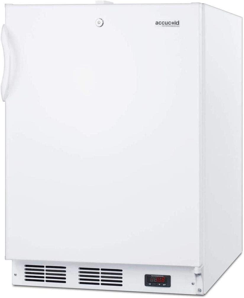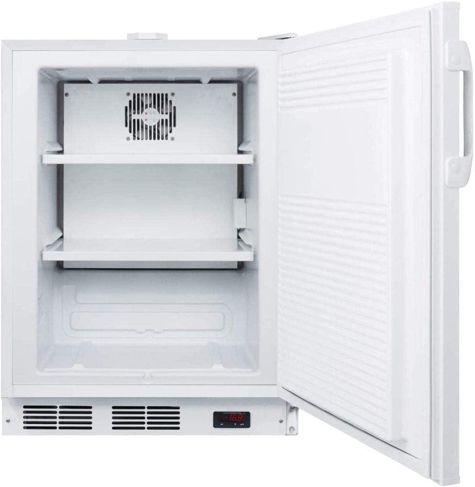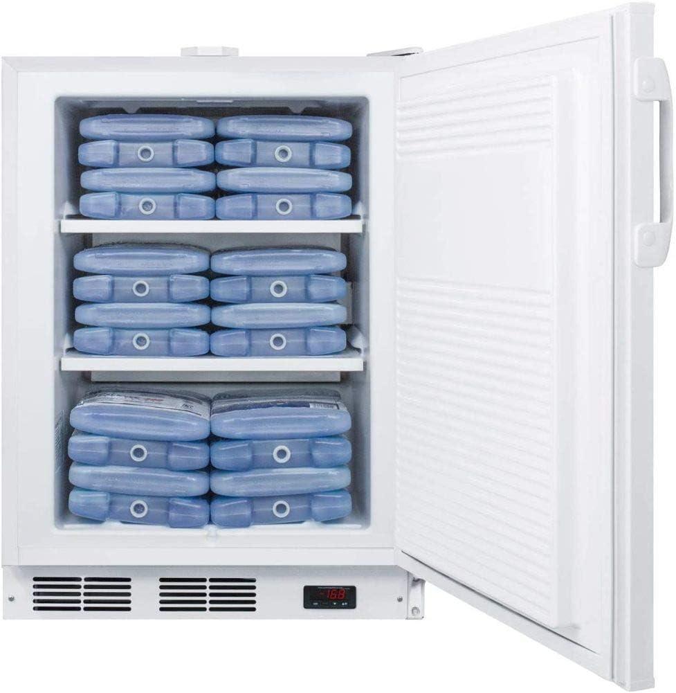 At 24″ wide and 32″ high, the ACF48WADA is ideally sized for various institutional settings following ADA guidelines for lower counter height. The front-breathing design allows built-in installation, while the fully finished cabinet also allows freestanding use. The user-reversible door includes a factory installed keyed lock for added security. This model comes in a white finish and includes a hospital grade cord with a 'green dot' plug for added security in high traffic areas. Full frost-free operation eliminates the need to defrost the interior, with an internal fan to keep the interior evenly cooled from top to bottom. A digital thermostat is located in the front kickplate, letting users manage the temperature without having to open the door. The interior includes two removable steel shelves.