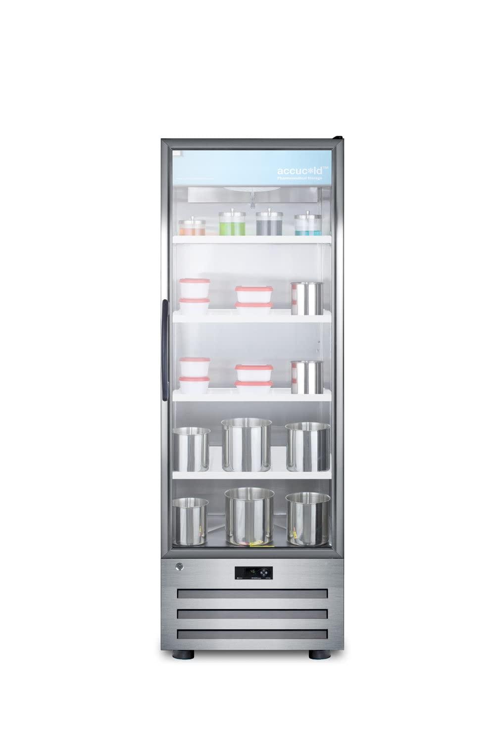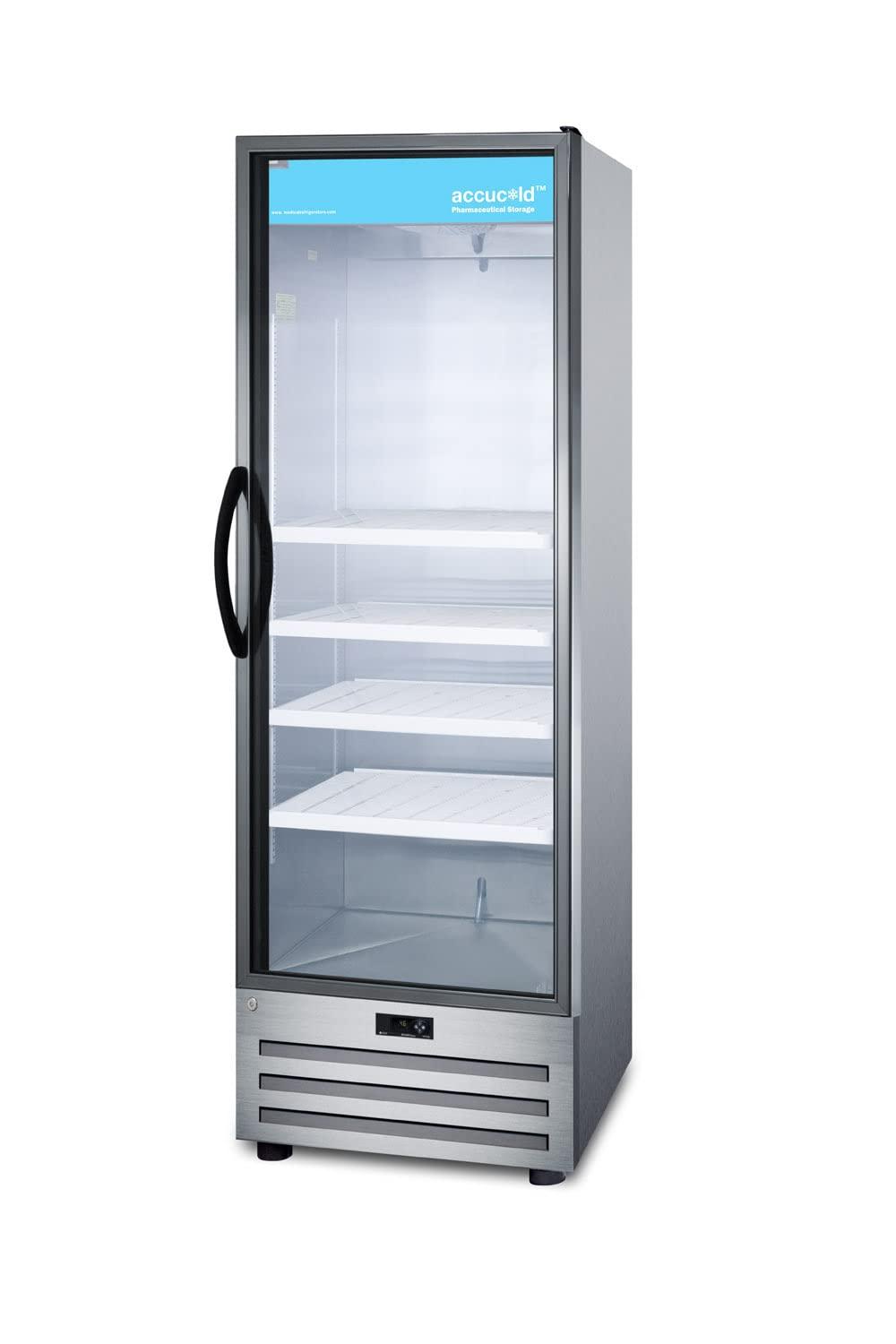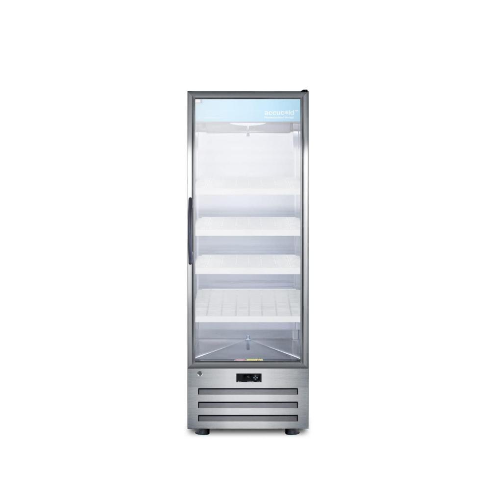 Accucold Pharmaceutical Refrigerator, 24″W, 14 cu. ft. capacity, +2° to +8°C temperature range, (1) right-hinged self-closing tempered glass door with lock, (4) adjustable cantilevered plastic shelves, digital thermostat