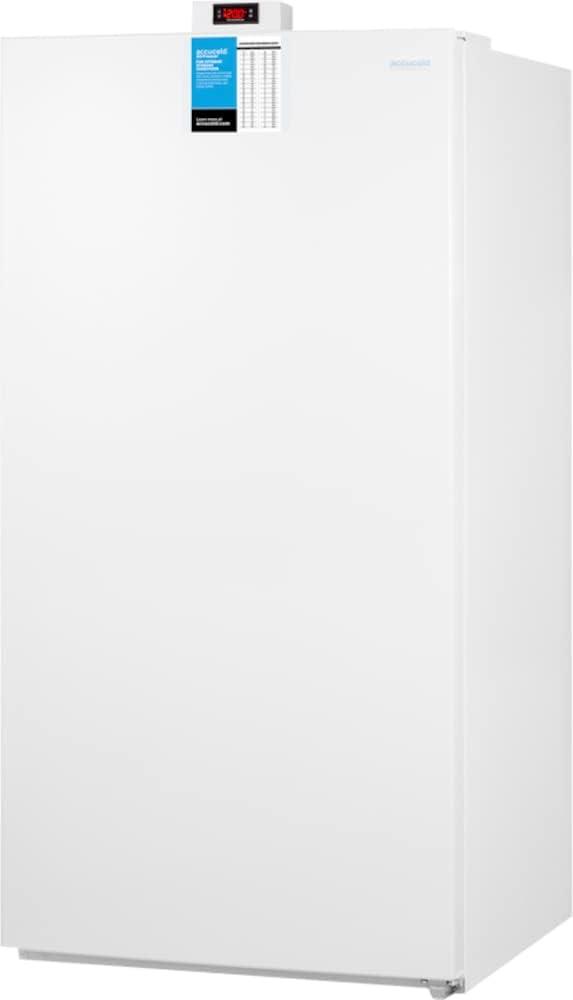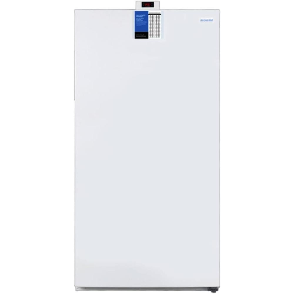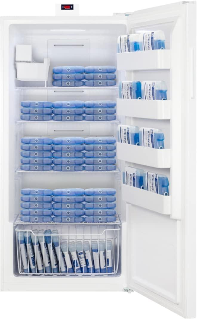 Accucold FFUF234IM 33″ Wide Upright All-Freezer with Icemaker, Magnetic Door Gasket, 21 cu.ft Capacity, Adjustable Shelves, Digital Controls, True No-Frost Operation, Sealed Back, Interior Light With its low maintenance design and large storage capacity, the FFUF234IM is ideal for storing non-critical products in research, clinical, and industrial laboratory applications (this is not a household freezer). Model FFUF234IM is an upright all-freezer with a full 21 cu.ft. storage capacity and factory-installed 8 lb. icemaker. It comes in a white exterior finish with a right hand door swing and powerful seal to ensure items are protected. This unit has a sealed back for easier cleanup and a right angle cord to allow a better fit. The digital control panel is located on top of the cabinet, allowing you to manage the interior temperature without opening the door. Key Features: – 21 cu.ft. of interior space – Electronic thermostat located on top of the freezer cabinet, allowing you to manage the temperature without opening the door – True no-frost operation that eliminates the need to ever manually defrost the interior – Factory-installed icemaker produces up to 8 lbs. of crescent shaped ice – 4 shelves provide convenient storage on the door – Interior light automatically illuminates when the door is opened – Powerful magnetic gaskets ensure a tight seal for energy savings and improved performance – Right hand door swing NOT reversible Specifications: – Capacity: 21.0 cu.ft. (595 L) – Door: White – Cabinet: White – Voltage/Frequency: 115 V AC/60 Hz – Amps: 1.8 – Thermostat Type: Digital – Door Swing: RHD – Crisper Cover: Wire – Shelf Qty: 4 – Full Door Shelves: 4 – Interior Drawers: Yes – Level Legs: 2 – Drawers Qty: 1 – Overall Dimensions (HxWxD): 79.75″ x 32.75″ x 30.25″ – Weight: 237 pounds