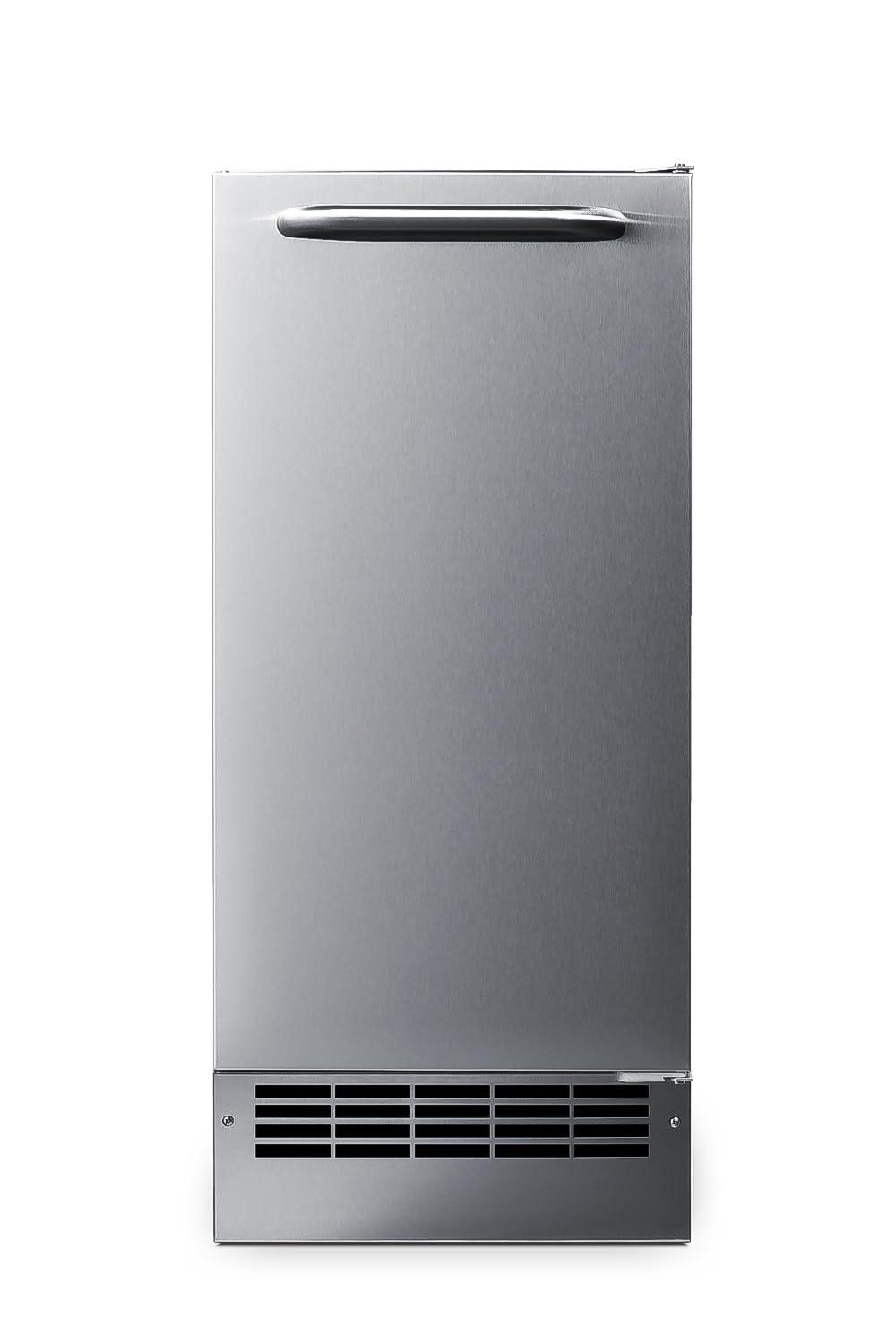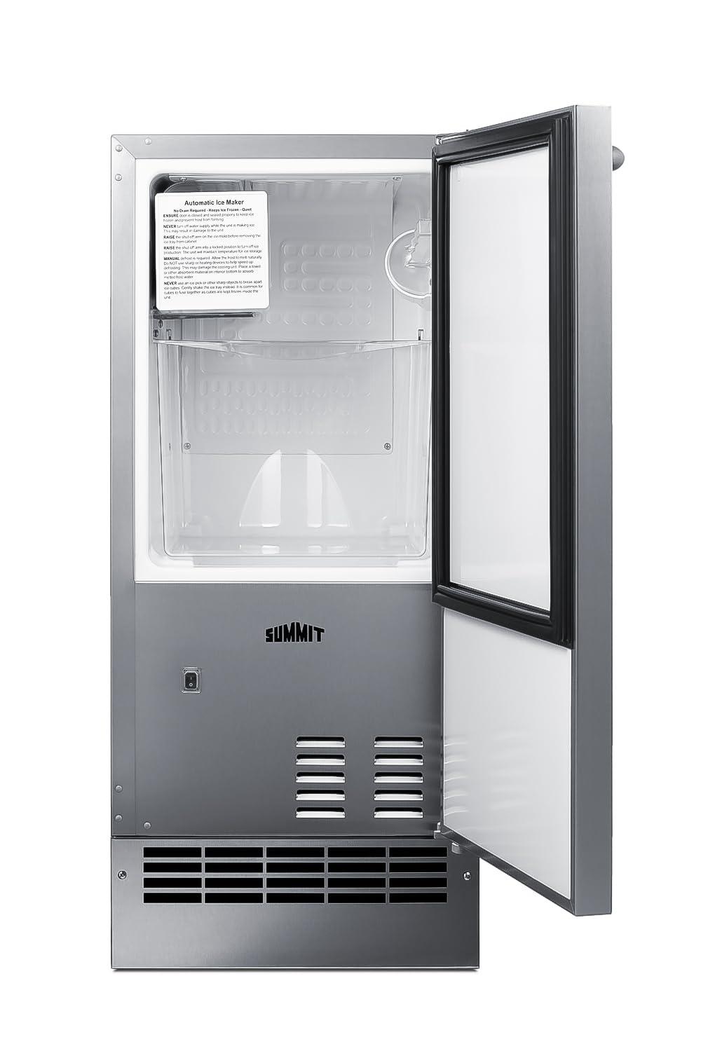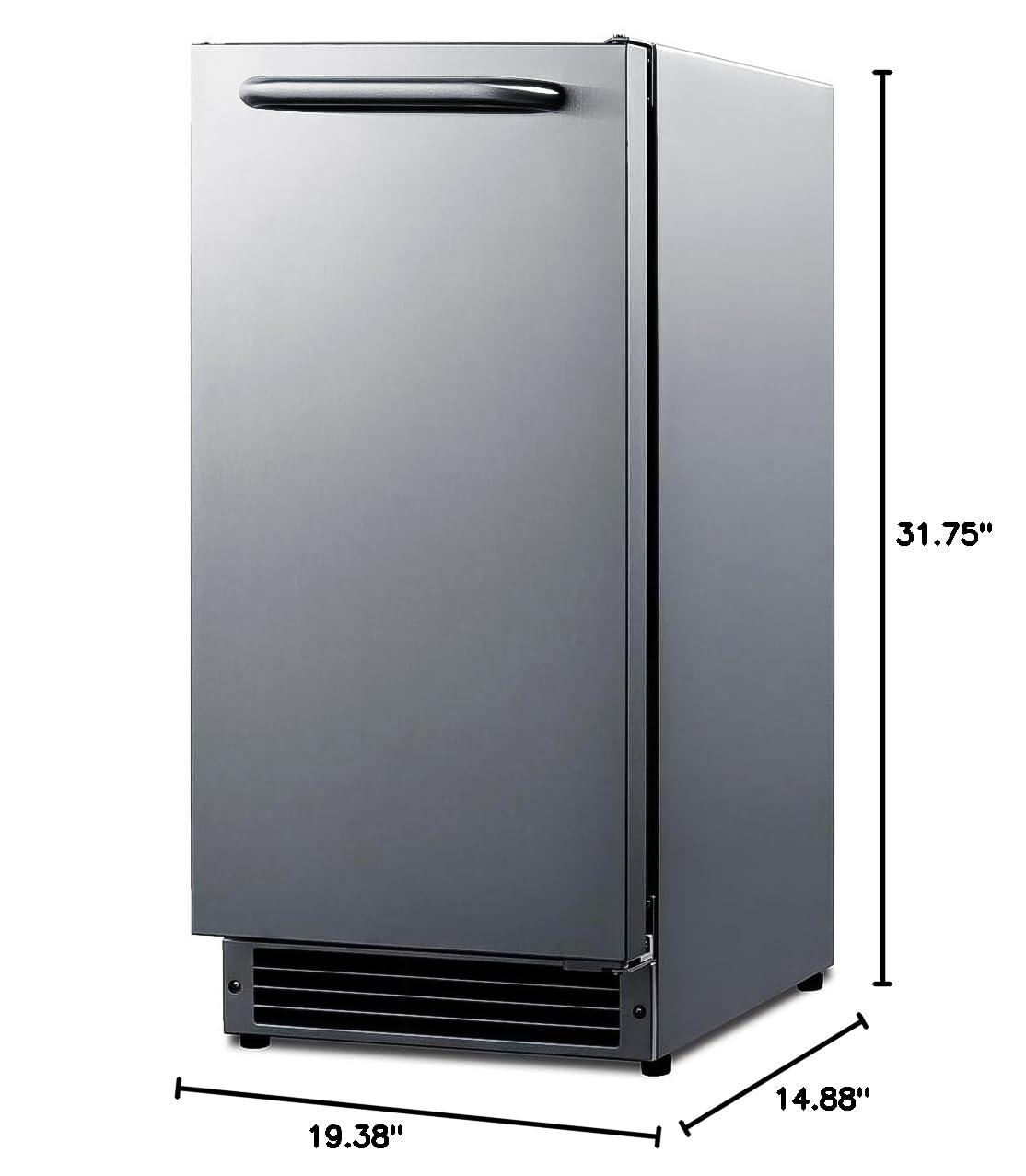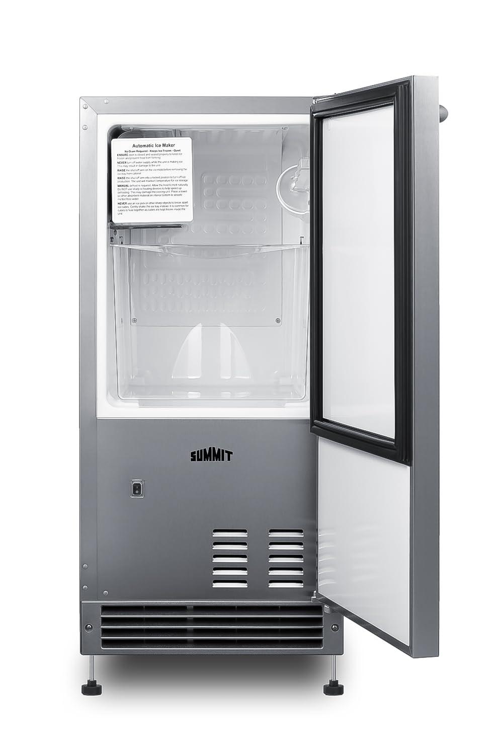 ADA-Compliant Drain Free Icemaker: Summit combines convenience and luxury to craft the BIM27OSADA- an under-counter icemaker finished in complete 304-grade stainless steel. This icemaker is an ADA-compliant model. Sized at just under 15″ wide, the BIM27OSADA features a front-breathing design for built-in installation but also has a fully finished cabinet to allow freestanding use. With a height of just under 32″, Summit designed this icemaker to be compatible with ADA-compliant counters. This unit can be raised to 34″. A taller kickplate is included for a streamlined and cohesive look.