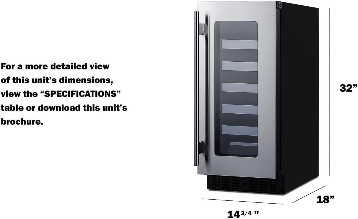 Summit 15” Wine Cellar, 18 Bottle Capacity, 1.8 cu.ft., Built-In Wine Cellar, ADA Compliant, Shallow Depth Fit, Stainless Steel- ASDW1522(Stainless Steel)