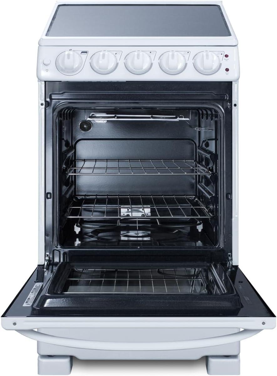 The perfect electric range for a small space without losing functionality: The smooth ceramic glass surface includes four 1200W 6 1/2″ elements, with a hot surface indicator light for added safety. Inside, a large 2.3 cu.ft. oven made from durable porcelain enamel. The waist-high broiler function is easy to use, with slide-out oven racks that can be adjusted in four different glide positions for the best fit.