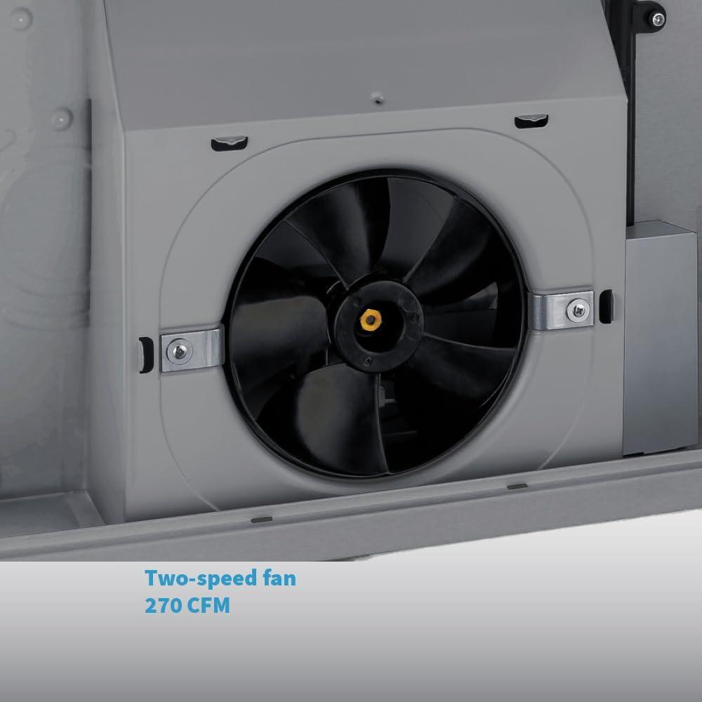 Built to work hard and last long: The powerful 2-speed fan is easily managed by a rocker switch with a high and low setting. This unit can operate at 270 CFM for thorough ventilation. Includes a combination aluminum mesh/charcoal removable filter to absorb grease, smoke, and odors.