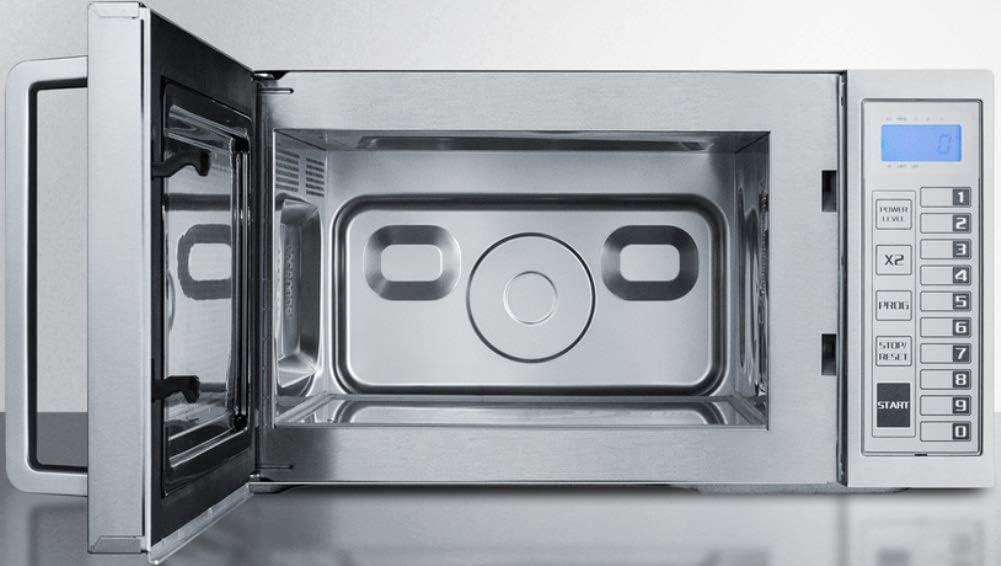 Commercial Microwave with everything you need: ETL-S listed to NSF-4 commercial standards, this 1000 watt countertop unit features a robust design for lasting durability. The stainless steel interior has a flat bottom with no turntable, ideal for high usage institutional settings.