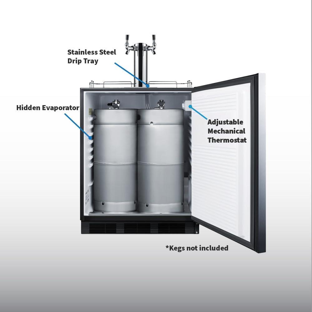 Dimensions & Build: 32.25″ H x 23.63″ W x 22.75″ D , Capacity 5.5 cu.ft. (156 L), Keg Capacity: Holds Two 1/6 (“Sixtel”) Kegs. Kegs not included.