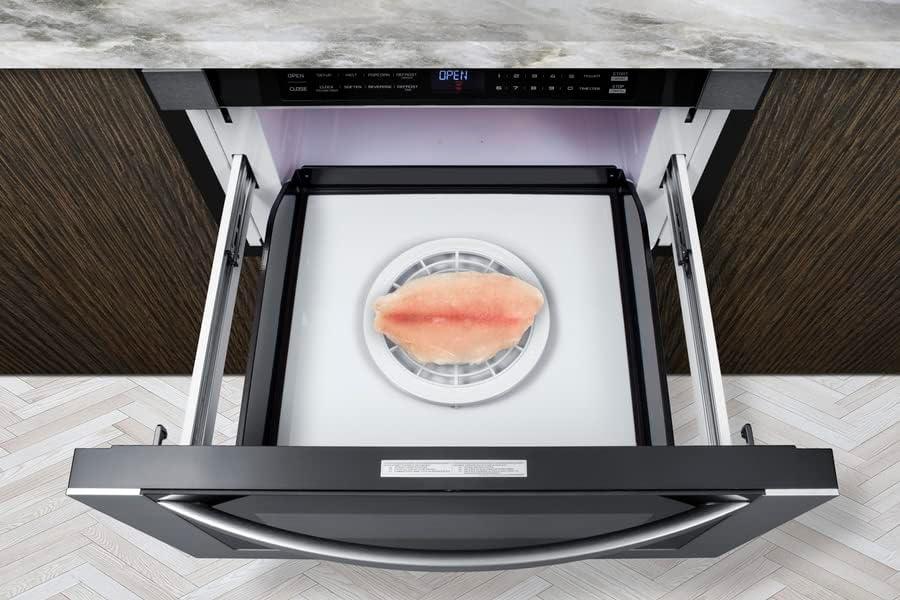 Easy access and top lead design: Slide-out drawer lets you check your cooking without removing it from the microwave, helping to reduce spills. Hold down the “open” and “close” buttons to access the microwave with minimal effort.