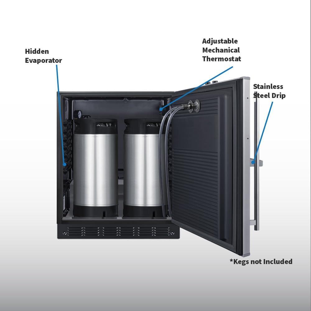 Dimensions & Build: 32.0″ H x 23.63″ W x 27.38″ D, Capacity 5.3 cu.ft. (150 L), Keg Capacity: Holds Two 1/6 (“Sixtel”) Kegs. Kegs not included.