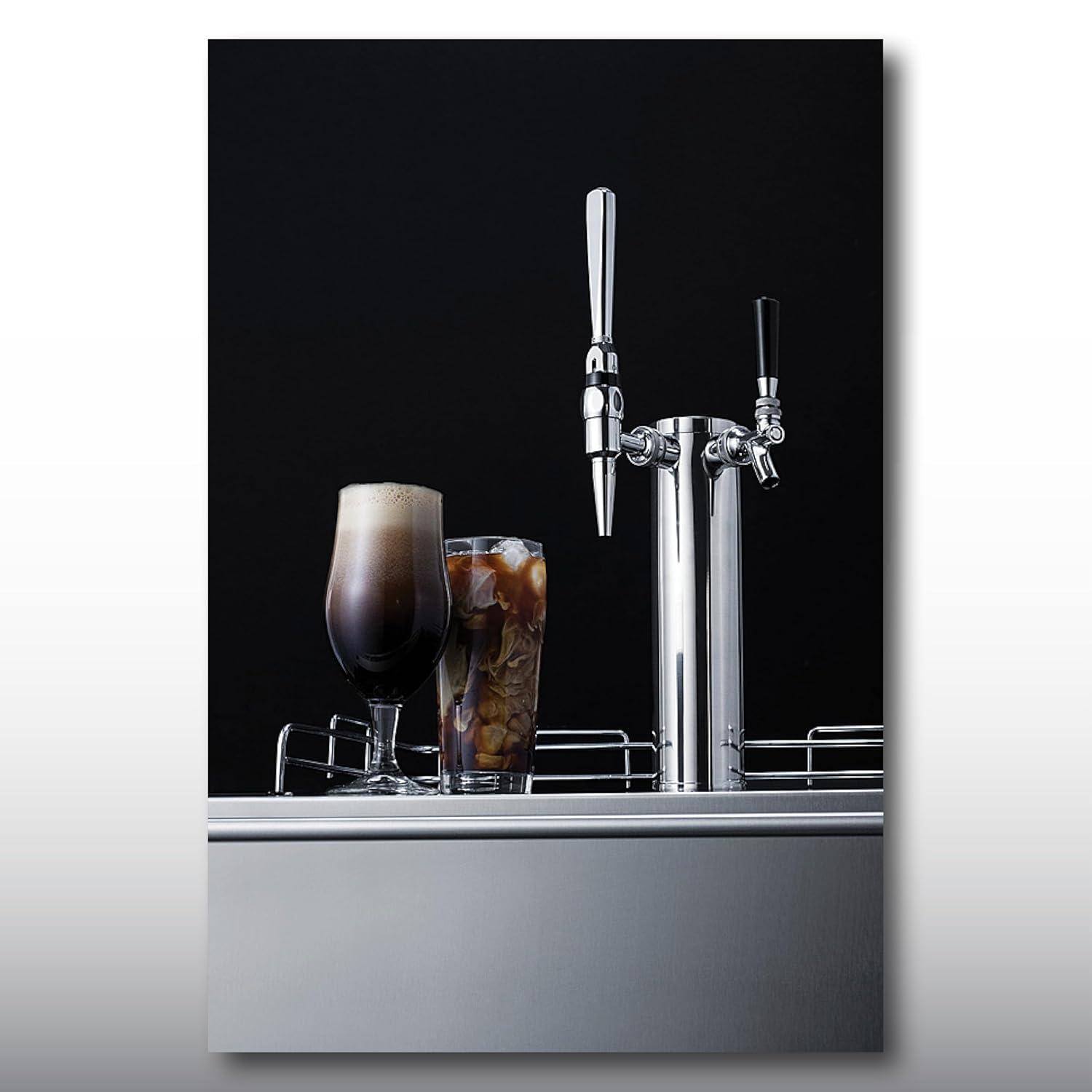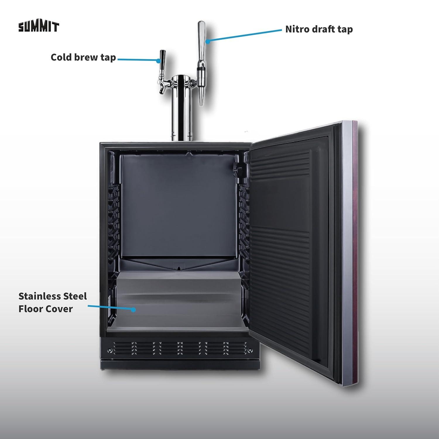 Perfect for your needs: With a 24” footprint, this coffee kegerator is designed to fit under the counter. Inside, the stainless steel floor ensures safer loading of heavy kegs. The kegerator interior includes a Nitrogen tank holder and space for two 1/6 (sixtel) kegs (not included). Nitrogen tank, regulator, dual tap kit with 1 standard handle and one stout style handle, and stainless steel drip tray included.