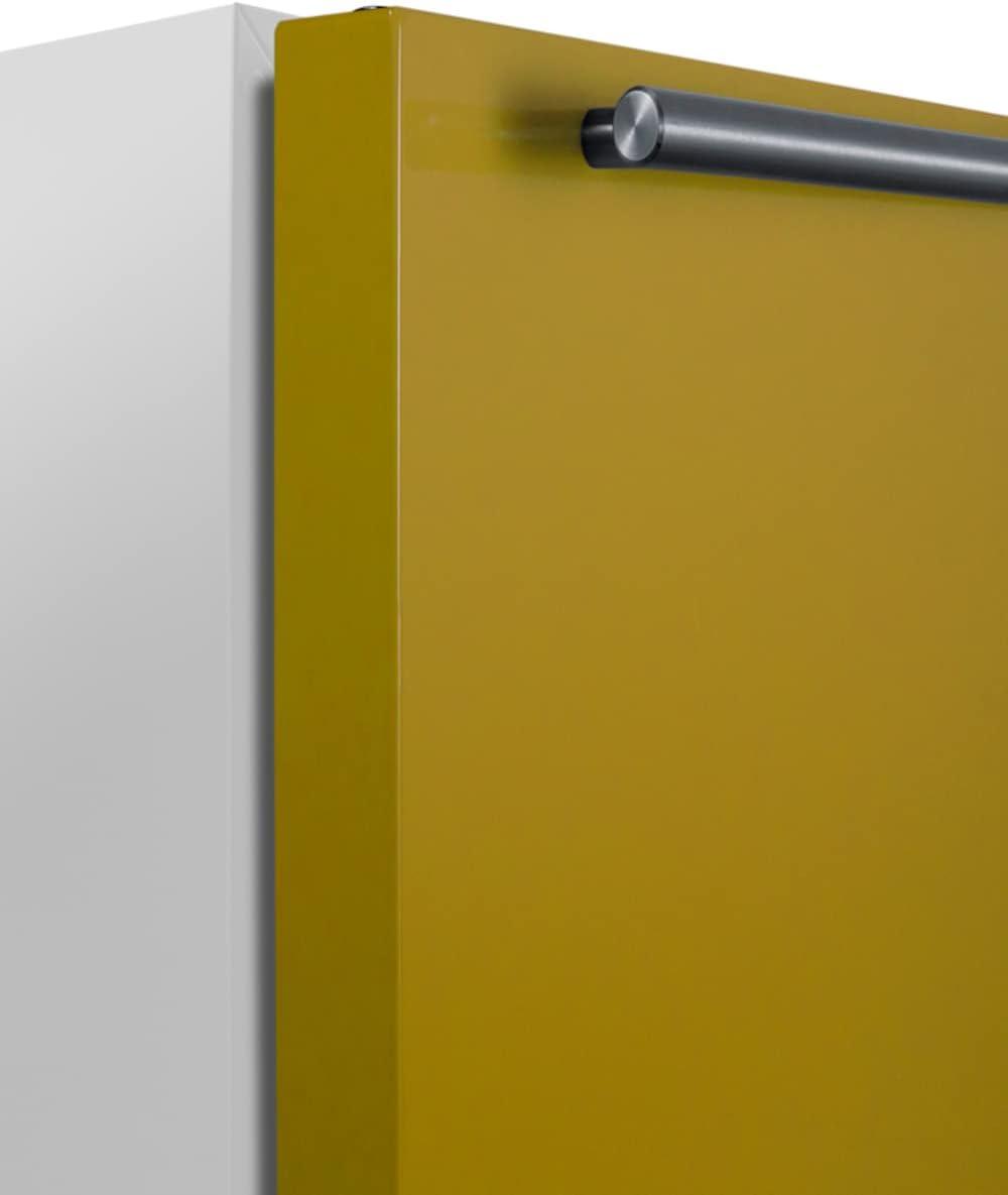 Model BRF611WHYADA is a 24″ wide refrigerator-freezer sized at just 32″ high for use in ADA compliant settings, with a generous capacity of more than 5 cu.ft. to meet general storage needs. The door comes in a bright saffron gold hue, with a sleek horizontally mounted stainless steel handle and matching stainless steel kickplate to complete the unique look. This unit has a white exterior cabinet. It is manufactured in Europe and modified in the United States with domestic steel finishing.
