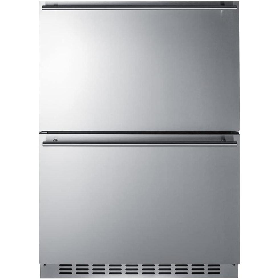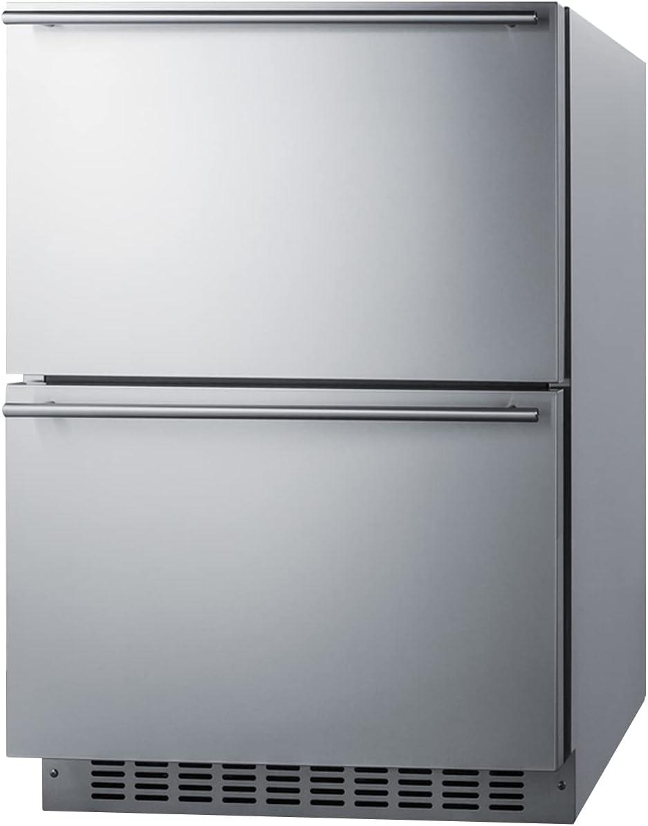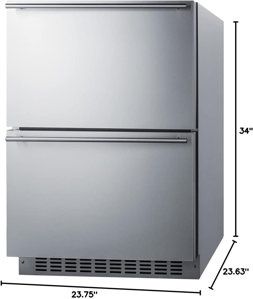 Summit Appliance SPRF34D 24inch Wide 2-Drawer Refrigerator-Freezer, Built-in Capable, Stainless Steel Construction, Panel-Ready Drawer Fronts, Digital Thermostat, LED Lighting, Adjustable Drawer Dividers The SPRF34D has a front-breathing design that allows built-in installation, while the fully finished stainless steel cabinet also enables freestanding use. Complete stainless steel construction inside and out offers long-lasting durability with professional elegance. The drawers can be customized with overlay panels to match or accent existing cabinetry design. The stainless steel kickplate and sleek, stainless steel handles complete the look, while a right-angle plug and sealed back offer added space savings when placing the unit. Key Features: – Complete refrigeration storage solution with top drawer refrigerator and bottom drawer freezer – Drawers accept overlay panels : 34inch x 23.63inch x 23.75inch – Capacity: 3.9 cu.ft. (110 L) – Defrost Type: Frost-Free – Door: Stainless Steelanel-Ready – Energy Usage/Year: 380kWh/year – Voltage/Frequency: 115 V AC/60 Hz – Weight: 108 lb – Door Swing: Drawer – Interior Light: yes – Thermostat Type: Digital – Sabbath Mode: yes – Freezer – Temperature Range: -11DegreeF to 11DegreeF