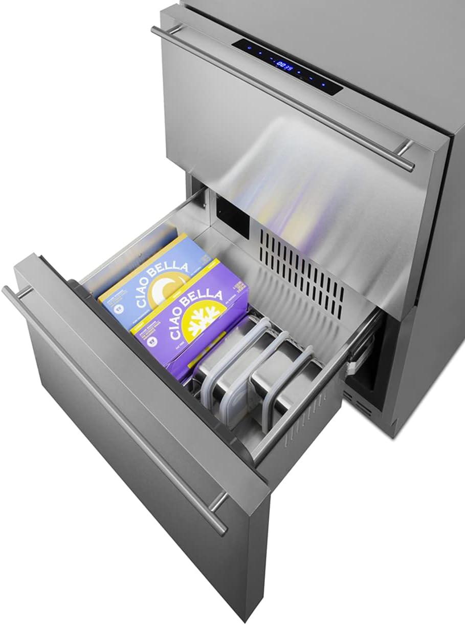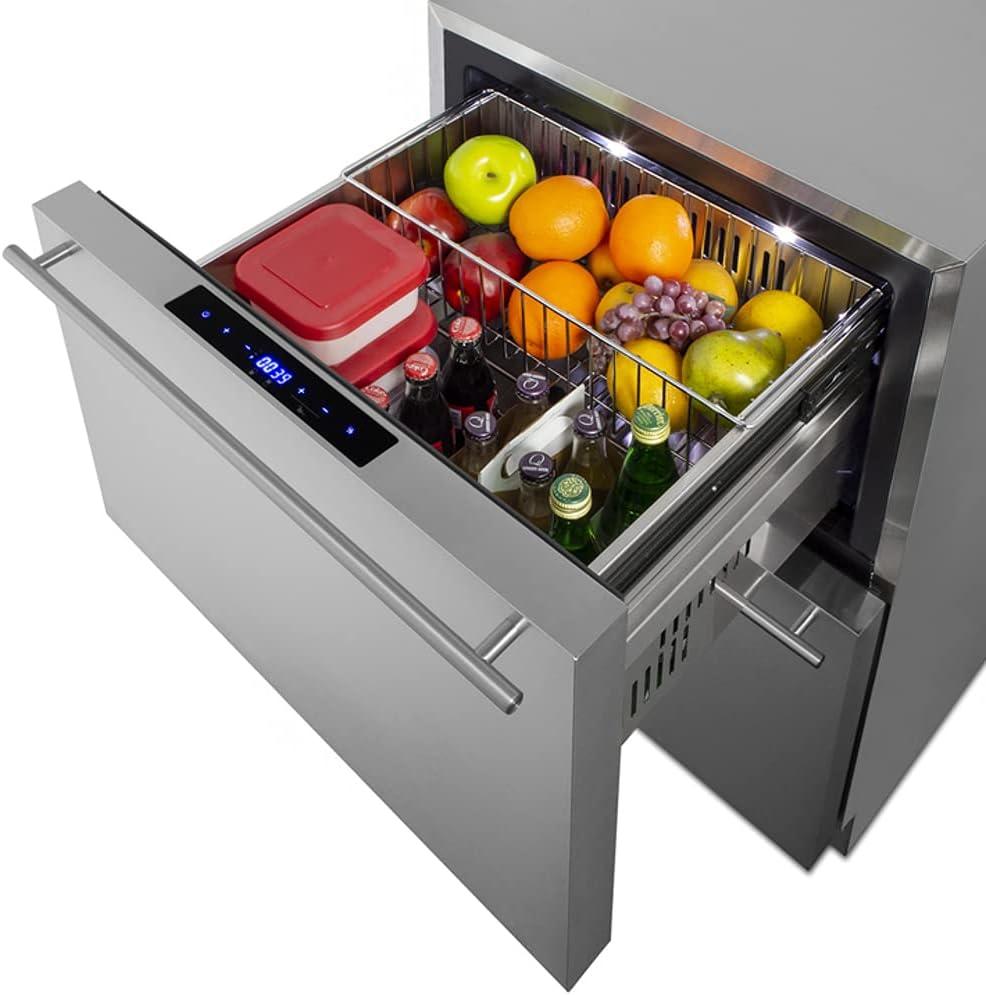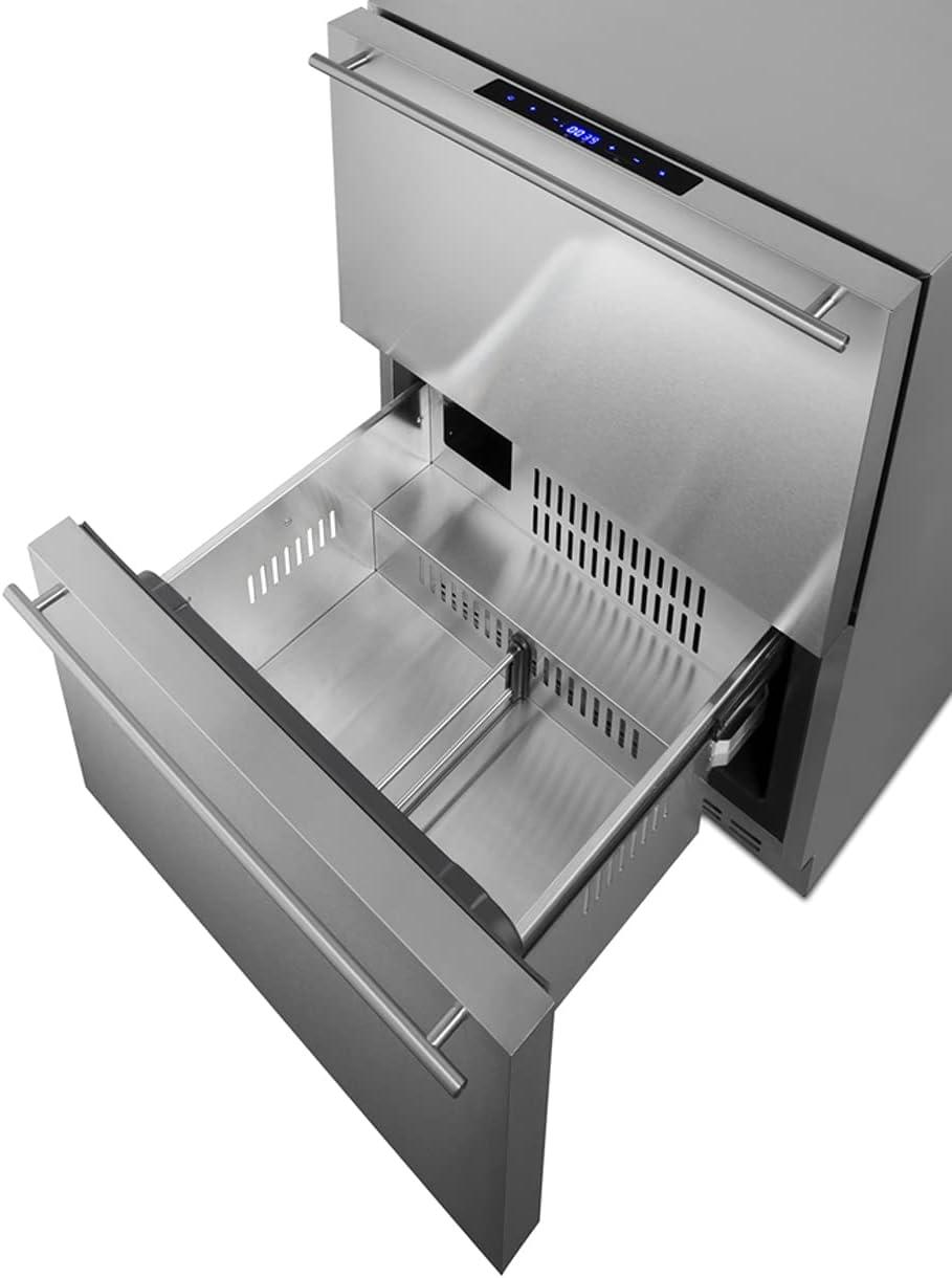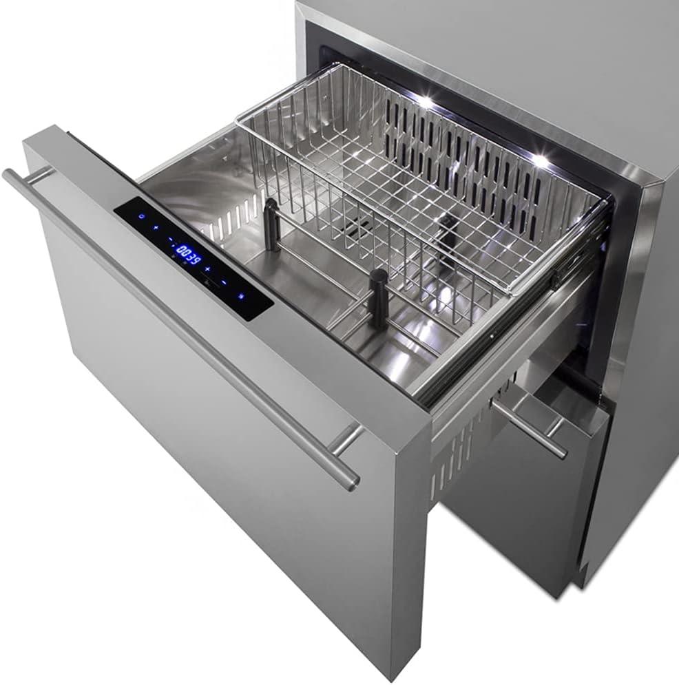 Summit Appliance SPRF34D 24inch Wide 2-Drawer Refrigerator-Freezer, Built-in Capable, Stainless Steel Construction, Panel-Ready Drawer Fronts, Digital Thermostat, LED Lighting, Adjustable Drawer Dividers The SPRF34D has a front-breathing design that allows built-in installation, while the fully finished stainless steel cabinet also enables freestanding use. Complete stainless steel construction inside and out offers long-lasting durability with professional elegance. The drawers can be customized with overlay panels to match or accent existing cabinetry design. The stainless steel kickplate and sleek, stainless steel handles complete the look, while a right-angle plug and sealed back offer added space savings when placing the unit. Key Features: – Complete refrigeration storage solution with top drawer refrigerator and bottom drawer freezer – Drawers accept overlay panels : 34inch x 23.63inch x 23.75inch – Capacity: 3.9 cu.ft. (110 L) – Defrost Type: Frost-Free – Door: Stainless Steelanel-Ready – Energy Usage/Year: 380kWh/year – Voltage/Frequency: 115 V AC/60 Hz – Weight: 108 lb – Door Swing: Drawer – Interior Light: yes – Thermostat Type: Digital – Sabbath Mode: yes – Freezer – Temperature Range: -11DegreeF to 11DegreeF