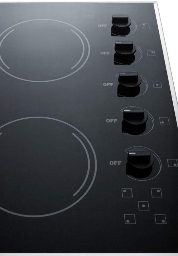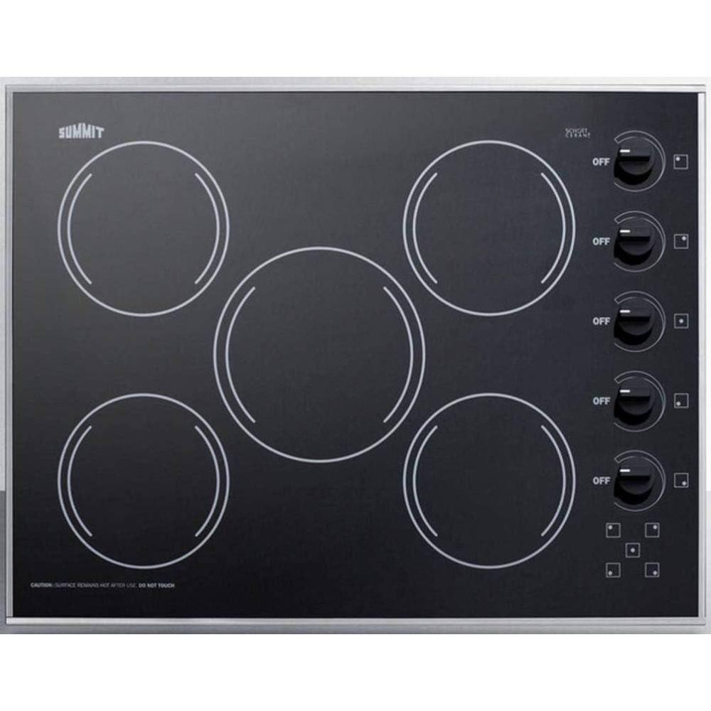 Summit Appliance CR5B273B 27″ Wide 230V 5-Burner Radiant Cooktop in Smooth Black Ceramic Glass Surface, Stainless Steel Trim, Push-to-turn Knobs, Indicator Lights, E.G.O. Burners
