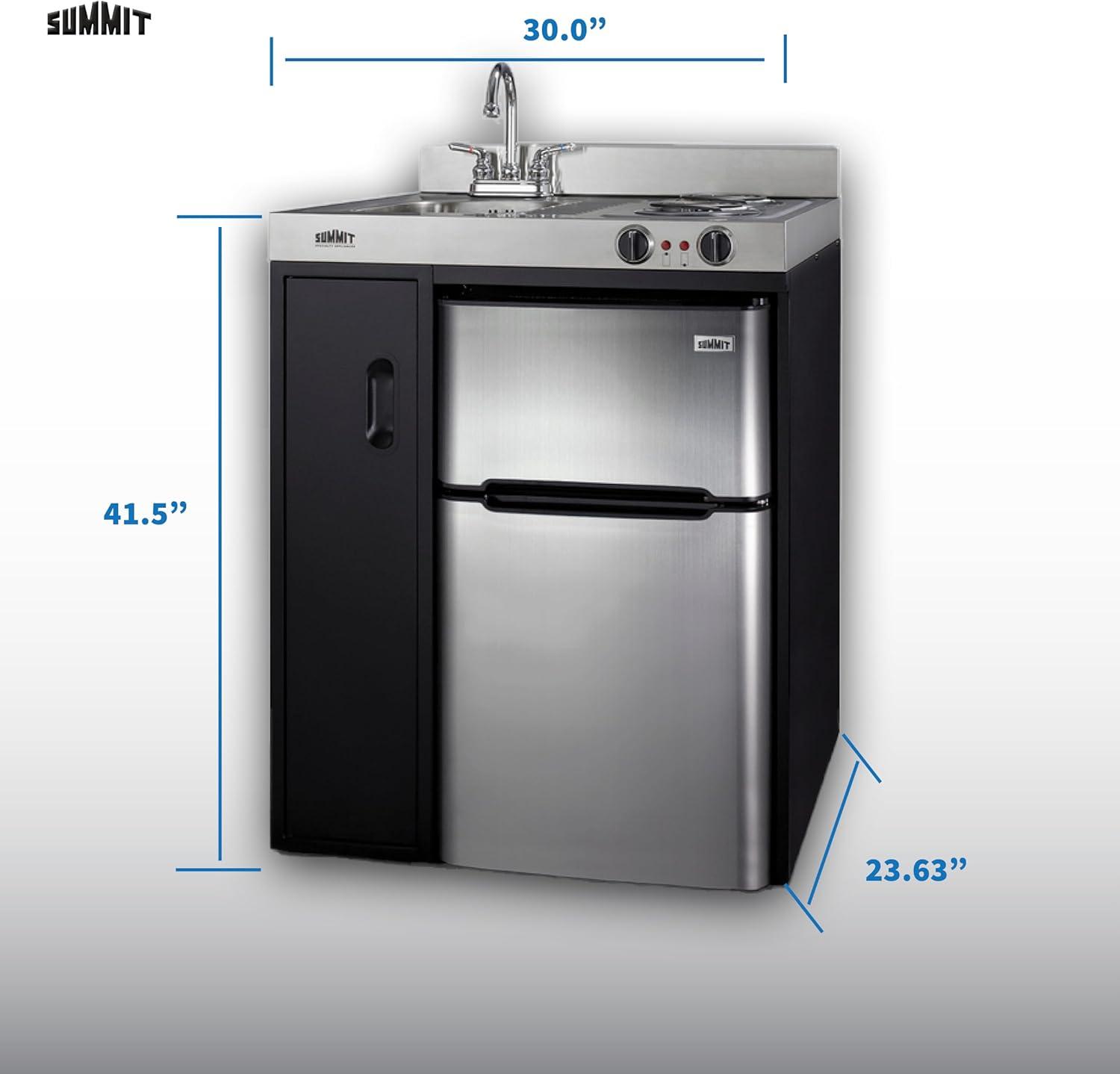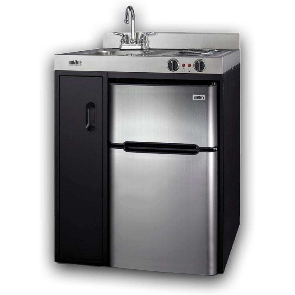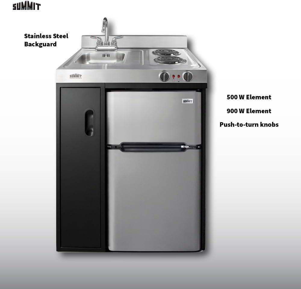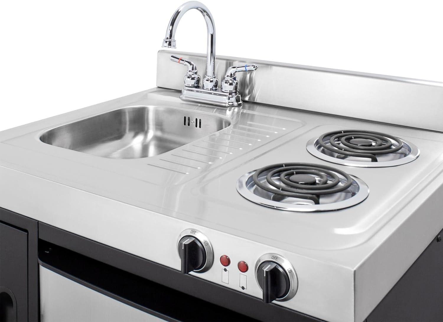 Everything you need in one unit: All-in-one kitchenette is built with a 3.2 cu.ft. ENERGY STAR certified refrigerator, stainless steel sink with gooseneck faucet, two coil elements (a rear 500W burner and front 900W burner), and storage compartment. Includes a one-piece stainless steel countertop.