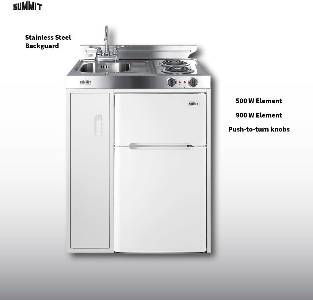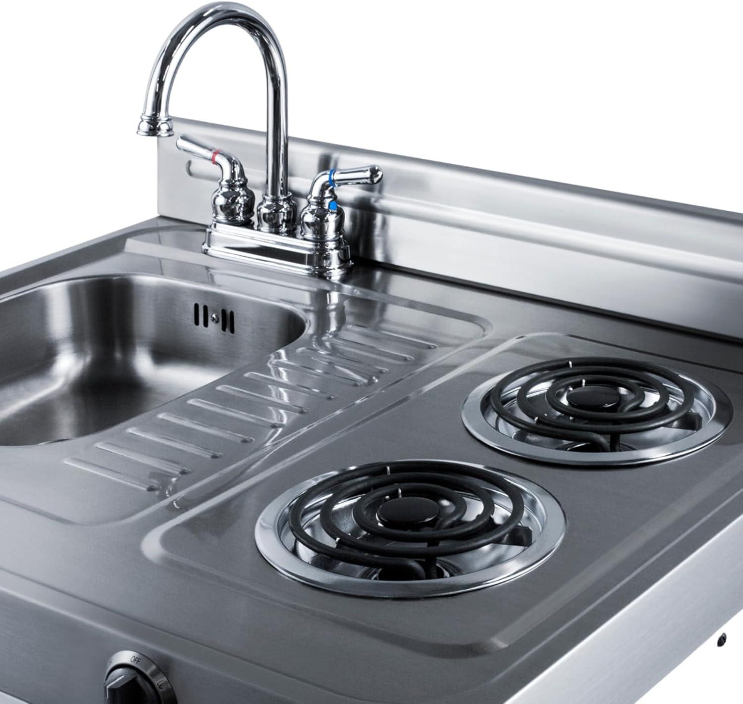 Everything you need in one unit: All-in-one kitchenette is built with a 3.2 cu.ft. ENERGY STAR certified refrigerator, stainless steel sink with gooseneck faucet, two coil elements (a rear 500W burner and front 900W burner), and storage compartment. Includes a one-piece stainless steel countertop.