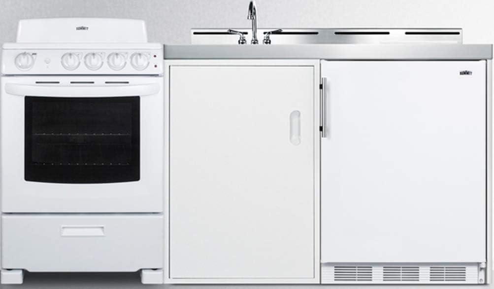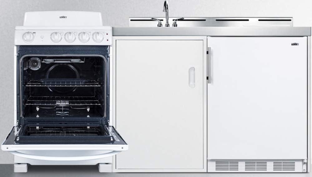 Summit Appliance ACK72COILW 72 Wide All-in-One Kitchenette with 220V 4-Element Electric Coil Range, Refrigerator-Freezer, Sink, Cutting Board and Cutlery Storage, and a Storage Cabinet Key Features Complete all-in-one convenience with a refrigerator-freezer, electric range, sink, and storage compartment in just 72 Includes RE2411W 4-element coil electric range, includes three 6 1250 elements and a larger 8 2400 element for larger cooking vessels, 2.9 cu.ft. oven with adjustable racks and indicator lights when oven is in use Includes CT661W 5.1 cu.ft. refrigerator-freezer includes adjustable glass shelves, door storage, and a crisper Convenient lower cabinet with adjustable shelf lets you store dry goods design without ozone-damaging chemicals SPECIFICATIONS Overview Height of Cabinet: 42 Width: 71.5 Depth: 24 Depth with door at 90 Degree : 45.38 Capacity: 5.1 cu.ft. Defrost Type: Cycle Door & Cabinet: White US Electrical Safety: ETL Canadian Electrical Safety: ETL-C Other Energy Info: 40A range/1.2A refrigerator Weight: 345 lbs. Shipping Weight: 385 lbs. Kitchenette Refrigerator Included: CT661W Refrigerator Door Swing: RHD Adjustable Shelves: Yes Shelf Type: Glass Shelf Qty: 3 Crisper Qty: 1 Crisper Finish: Transparent Crisper Cover: Glass Full Door Shelves: 3 Thermostat Type: Dial Interior Light: Yes Refrigerant Type: R600a Refrigerant Amount: 0.92 oz. Cooking Type: Coil Range Number of Burners: 4 Cooktop Controls: Dial Range Included: RE2411W Oven Included: Yes