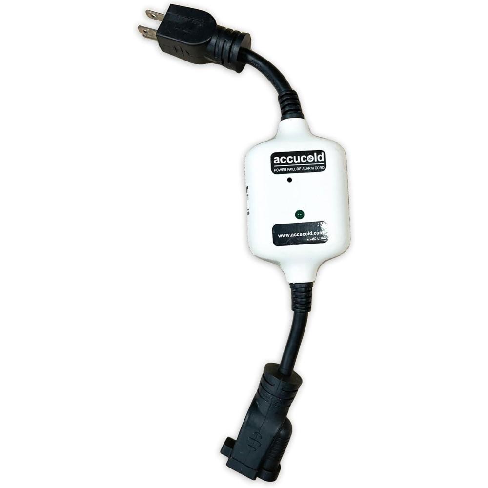 This ACCUCOLD power-failure line cord has a built-in power failure sensor with an 80dB loud audible alarm. It is intended for monitoring essential 120-volt AC-powered cord-connected appliances for power failure events, accidental cord disconnection, and circuit breaker failure. The loud signal sounds for up to 90 minutes, advising the user to reconnect power to the device. Perfect for Monitoring Refrigerators, Freezers, Sump Pumps, and Aquariums.