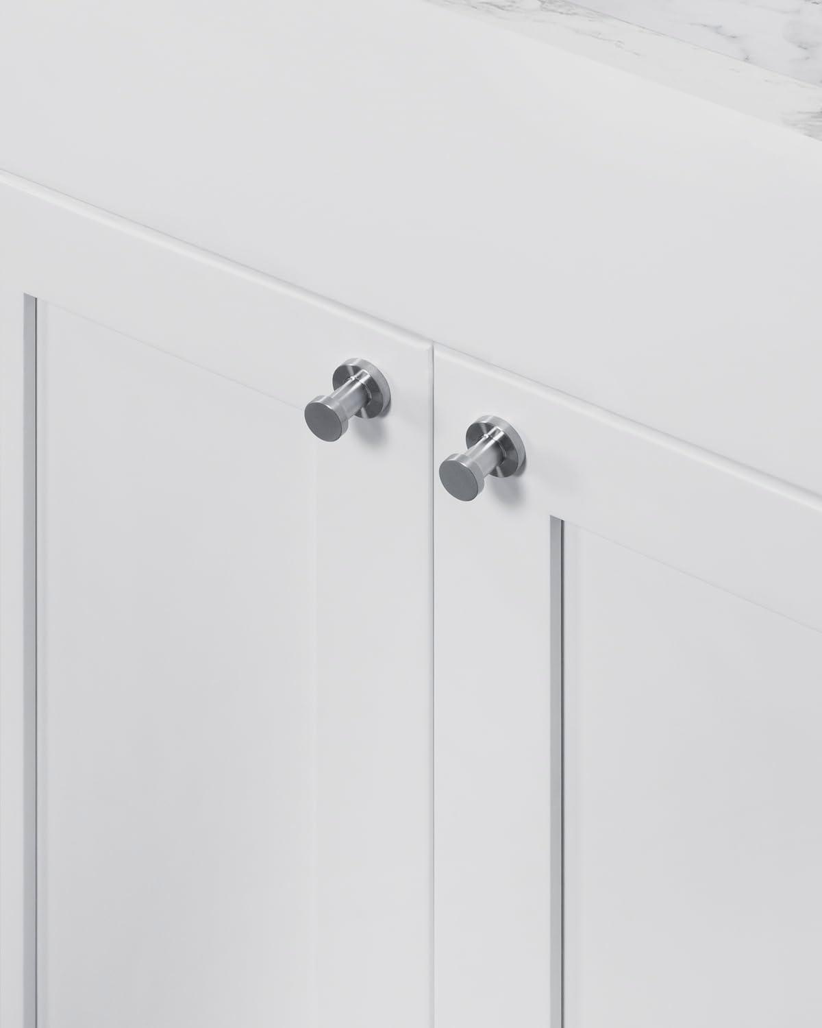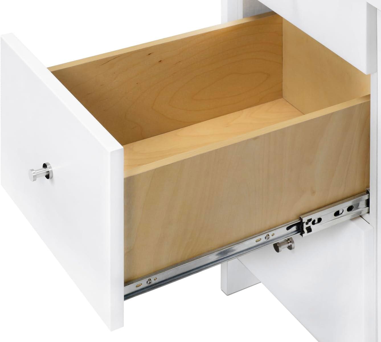 A great look with tons of features and storage: The Caldera is 63″ wide in a classic white finish. It features hardwood construction, a stainless steel sink with faucet on the left hand side, and a countertop made from a water-resistant laminate with a marble look. For dry storage, this unit includes a two-door cabinet and two soft-close drawers with door knobs in an attractive brushed nickel finish.