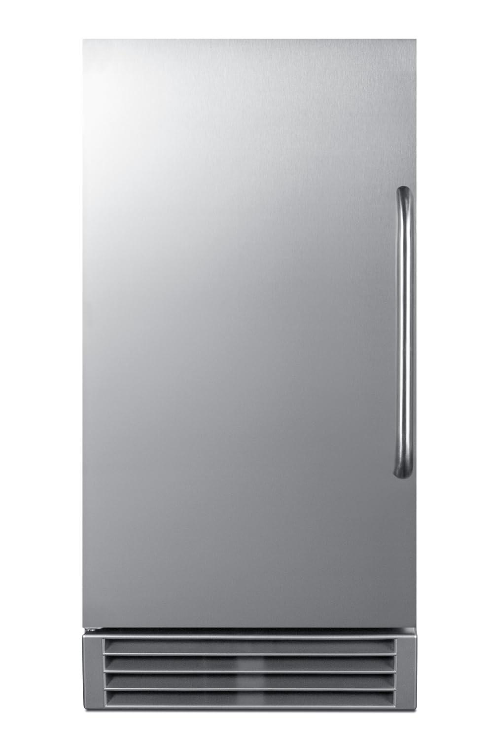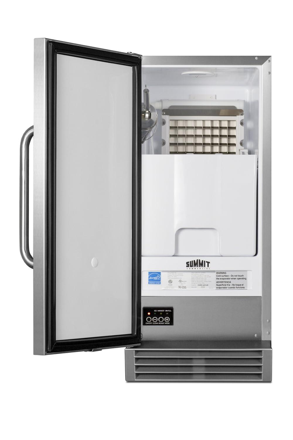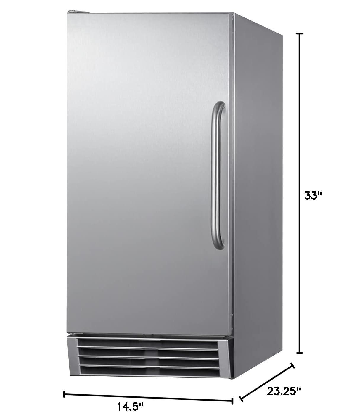 Summit Appliance BIM47OS Built-In Icemaker, Weatherproof Design for Outdoor Use, 14.5 inch Wide, 50 lb Production Capacity, Built-in Pump, Automatic defrost, Stainless Steel Door, Touch Control Panel ENERGY STAR certified for commercial use, BIM47OS features a complete stainless steel exterior specially built to hold up to the outdoor elements. The front-breathing design allows built-in use under counters, while the fully finished stainless steel cabinet also allows freestanding use, with a sealed back for added outdoor protection and easier cleanup. The user-reversible stainless steel door includes a curved towel bar handle for a professional look. NOTE: this unit ships with a left hand door swing that can be reversed before delivery (add suffix RHD) or at home. Key Features: – Built-in capable – Durable stainless steel construction for safe installation in outdoor spaces – Can make up to 50 lbs. of clear ice cubes in a day cycle and store up to 25 lbs – Internal pump affords more flexibility in placing the unit – Automatic defrost – Produces 34 inch x 34 inch x 1 inch clear ice cubes – Touch panel provides easy operation of the unit with indicator lights for each stage of the production process – Insulated storage bin – Lighting in a soft blue hue for easy viewing of the interior – ENERGY STAR certified commercial performance Specifications: – Dimensions (HxWxD): 33 inch x 14.5 inch x 23.25 inch – Defrost Type: Automatic – Door: Stainless Steel – Cabinet: Stainless Steel – Amps: 4.8 – VoltageFrequency: 115 V AC60 Hz – Weight: 100 lb – Drain Required: Yes – Daily Ice Production: 50 lb – Ice Storage Capacity: 25 lb – Ice Shape: Cube – Size of Cube: 78 inch x 78 inch x 78 inch – Number of Ice Cube Sizes: 1 – Level Legs: 4