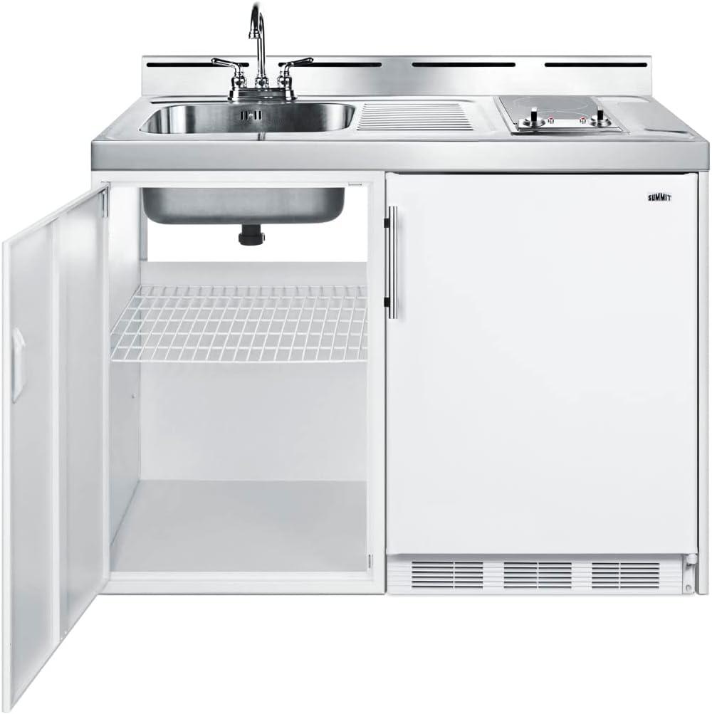 Summit Appliance C48ELGLASSPUMP 48″ Wide All-In-One Kitchenette, No Plumbing Needed; 5.1 cu.ft. Capacity; 2-Burner Radiant Cooktop; Refrigerator-Freezer; Sink; Storage Cabinet; and Water Pump(White)