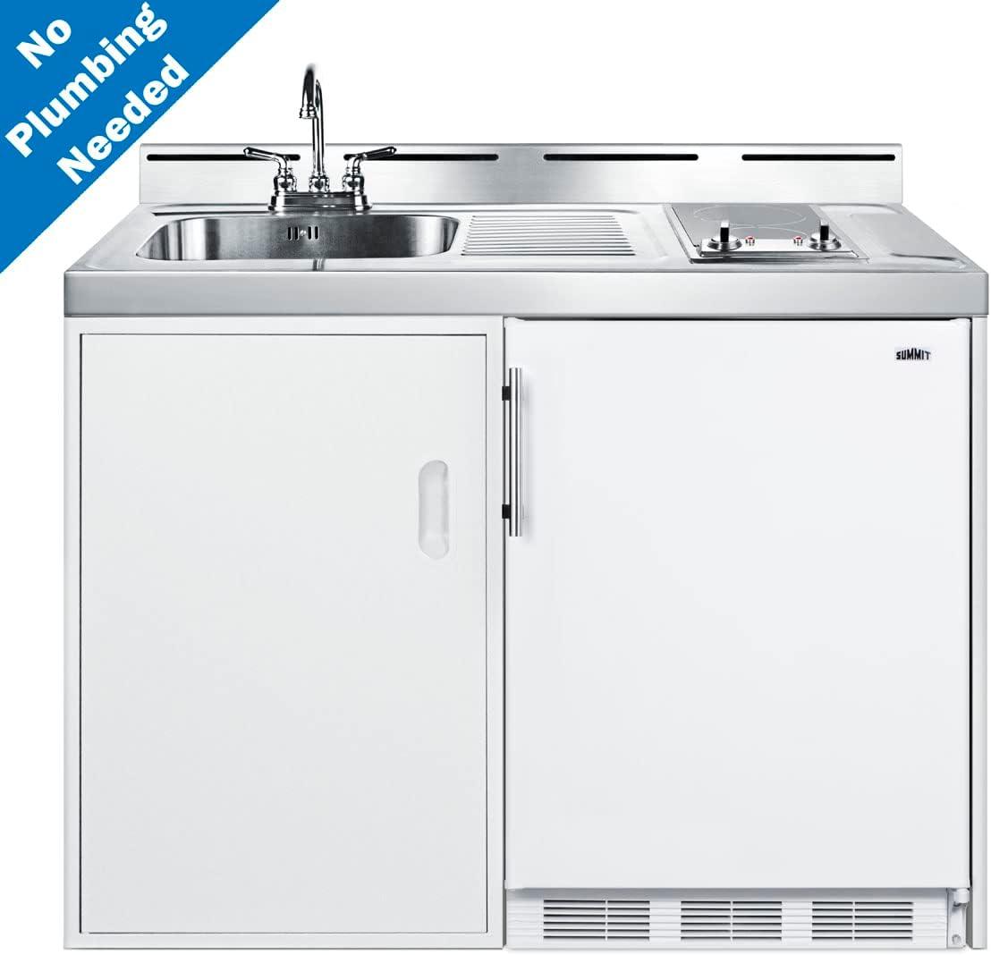 Summit Appliance C48ELGLASSPUMP 48″ Wide All-in-one Kitchenette with a 2-Burner Radiant Cooktop, Refrigerator-Freezer, Sink, Storage Cabinet, and Water Pump Kit for Applications with No Plumbing Key Features – Includes a refrigerator-freezer, 2-burner cooktop, sink, and water pump kit to meet all of your basic kitchen needs – Includes CT661W European refrigerator-freezer, offering 5.1 cu.ft. of storage capacity with adjustable glass shelves, door racks, a scalloped steel wine shelf, and large crisper drawer – Includes a 5 3/4″ 600W front element and 7″ 900W rear element in a smooth black finish for easier cleanup and safer cooking – CKPUMPKIT ships with all of the pieces you need to connect the water jug and waste container to your sink – Both the cooktop (12 amps) and refrigerator (1.2 amps) include 3-pronged cords for easy setup – Classic white cabinet finish with a durable stainless steel work surface and backguard Specifications – Height of Cabinet: 40″ – Width: 47.25″ – Depth: 24″ – Depth with door at 90: 44.25″ – Capacity: 5.1 cu.ft. – Defrost Type: Cycle – Door & Cabinet: White – US Electrical Safety: ETL – Canadian Electrical Safety: ETL-C – Amps: 25 – Voltage/Frequency: 115V AC/60Hz – Refrigerator Included: CT661W – Refrigerator Door Swing: RHD – Adjustable Shelves: Yes – Shelf Type: Glass – Shelf Qty: 3 – Crisper Qty: 1 – Crisper Finish: Transparent – Crisper Cover: Glass – Full Door Shelves: 3 – Thermostat Type: Dial – Interior Light: Yes – Refrigerant Type: R600a – Refrigerant Amount: 0.92 oz. – Cooking Type: Smooth-Top Cooktop – Number of Burners: 2 – Cooktop Controls: Dial – Interior 1: 19.5″Hx20.5″Wx17″D – Interior 2: 5.0″Hx19″Wx11.5″D – Compressor Step: 7″Hx20.5″Wx5″D – Sink: 5.88″Hx16.75″Wx14.88″D – Weight: 250 lbs. – Shipping Weight: 271 lbs.