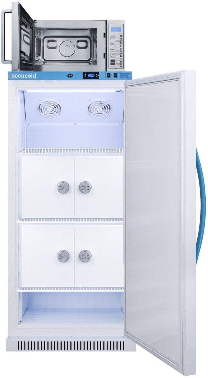 The MLRS8MCLK-SCM1000SS combines Accucold’s MOMCUBE 8 cu.ft. all-refrigerator for breast milk storage with Summit’s stainless steel commercial microwave. The refrigerator's reversible door allows for additional flexibility in unit placement. The MLRS8MCLK has four lockers, each with a combination lock to ensure privacy for mothers storing their milk, which can be reset or overridden as needed with included master keys. The SCM1000SS is a 1000W microwave and is ETL-S listed to NSF-4 commercial standards.