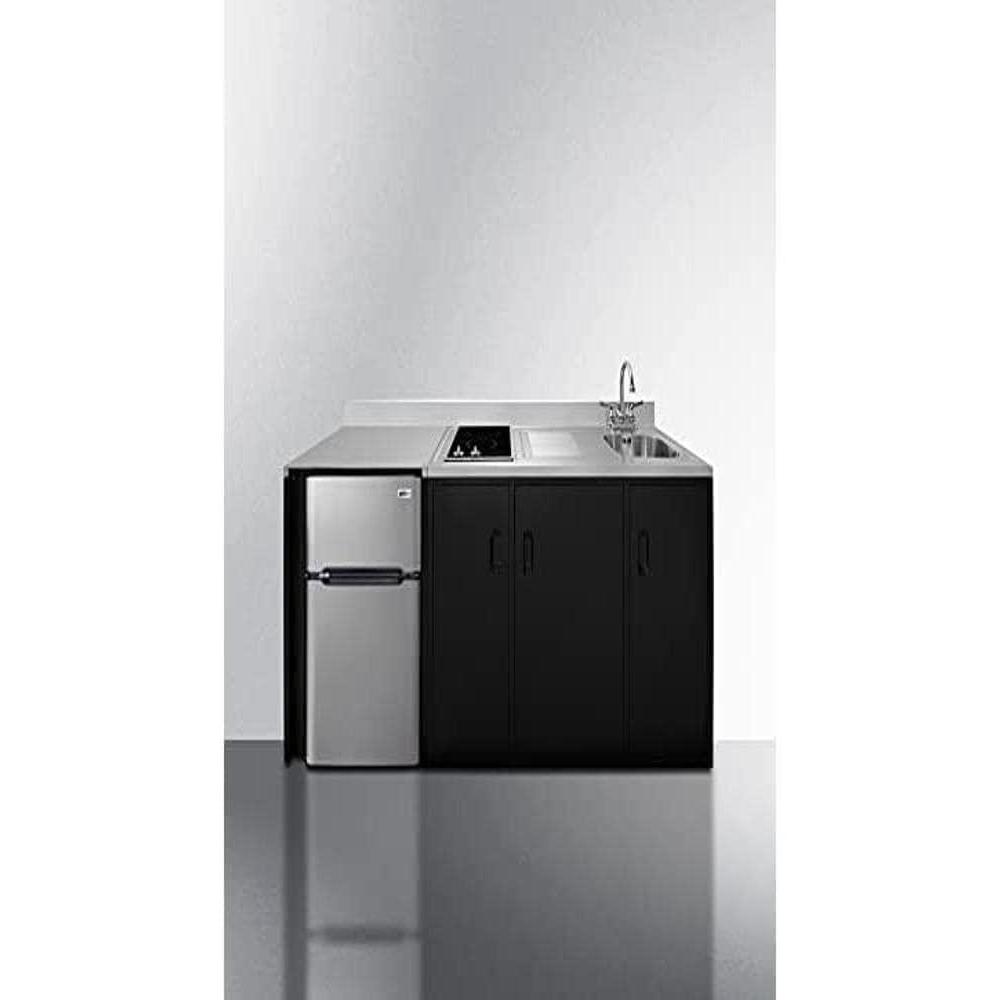 The CK72ADASINKR is 72″ wide with a 34″ ADA counter height for added accessibility. Its black exterior brings a modern look to efficiency spaces, with added touches of stainless steel on the kitchenette work surface and refrigerator doors. This unit includes a built-in 115V smooth-top cooktop with a rear 7″ 900W and a front 5½” 500W heating element. The power cord comes pre-installed for easy setup. The left side of the kitchenette features a compact sink with ready-to-use faucet, while the right side has a stainless steel counter area for food prep. Two single-door cabinets include a removable wire shelf, perfect for storing cleaning supplies, while a French-door style cabinet has a sold removable shelf, ideal for dry storage. Two grooved handles on each side allow for easy movement of the unit. Unlike many other brands' kitchenettes, all Summit units include a refrigerator with a freezer compartment to cover all of your cold storage needs. The CK72ADASINKR includes the two-door, ENERGY STAR certified CP34BSS, with 3.2 cu.ft. of storage space. A dual evaporator system separately cools the auto defrost refrigerator section and manual defrost freezer compartment for improved overall performance. This model also includes an adjustable glass shelf, door storage, and a crisper. The CK72ADASINKR is packaged and shipped in one box. Perfect for studio apartments, hotel rooms, dormitories, assisted living facilities, temporary kitchen facilities, and any other location in need of a low maintenance, fully-featured compact kitchenette. For this unit with a sink located on the left of the kitchenette, see the CK72ADASINKL.