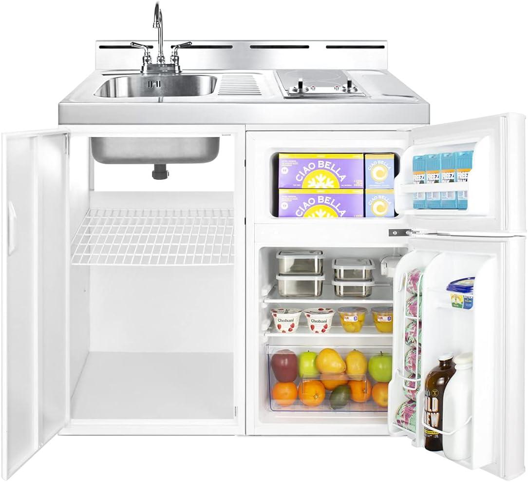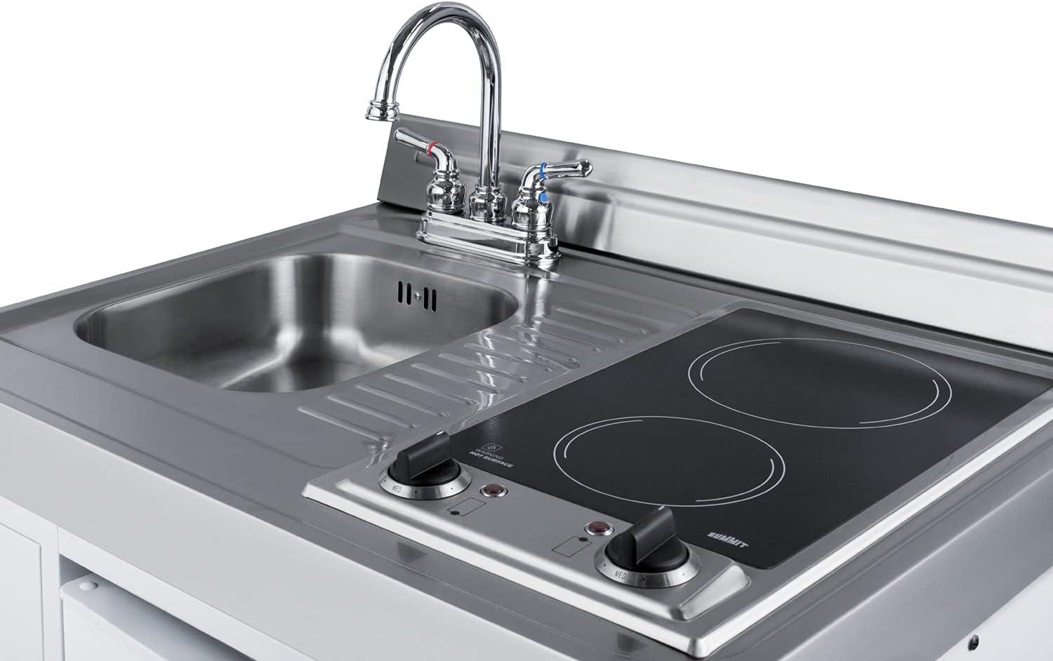Everything You Need in One Unit: All-in-one kitchenette is built with a 3.2 cu.ft. refrigerator, stainless steel sink with gooseneck faucet, and storage compartment. 2-burner smooth-top cooktop includes a 5 3/4″ 600W front element and 7″ 900W rear element. Includes a one-piece stainless steel countertop.