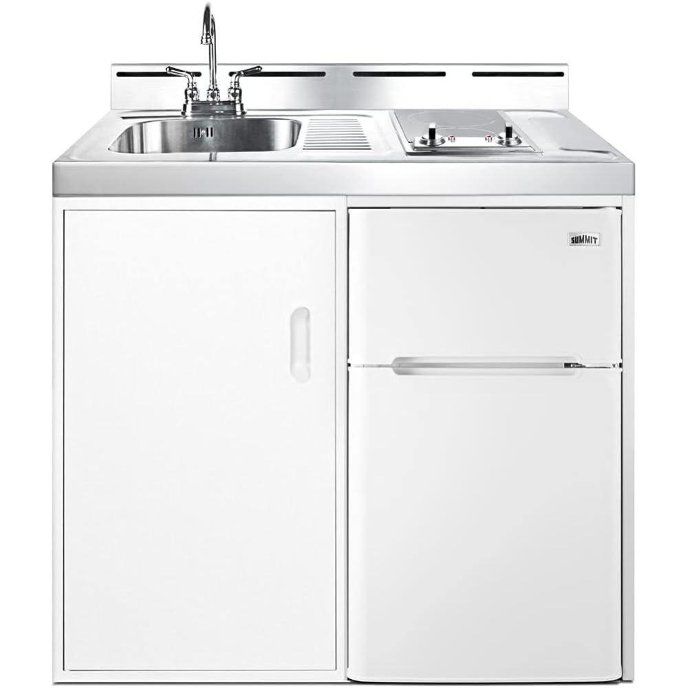 Summit Appliance C39ELGLASS 39″ Wide All-in-One Range, 2-Door Refrigerator-Freezer, Sink & Faucet, 115V Operation, 2-Burner Smoothtop Cooktop, Push-to-Turn Knobs The C39ELGLASS is a 39″ wide, 24″ deep, easy-adjust all-in-one range. The 115V radiant cooktop features a smooth black ceramic glass surface with 6-inch 600W and 7-inch 900W heating elements and pre-installed cord. The stainless steel countertop offers durability with a professional look. This unit includes a compact sink with an included ready-to-use faucet. A cabinet with a pull-out shelf is located below the sink for dry storage. Key Features: