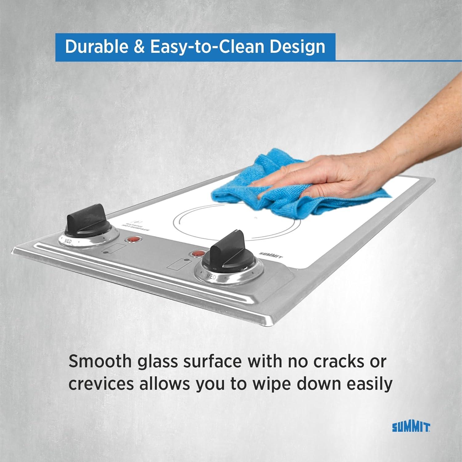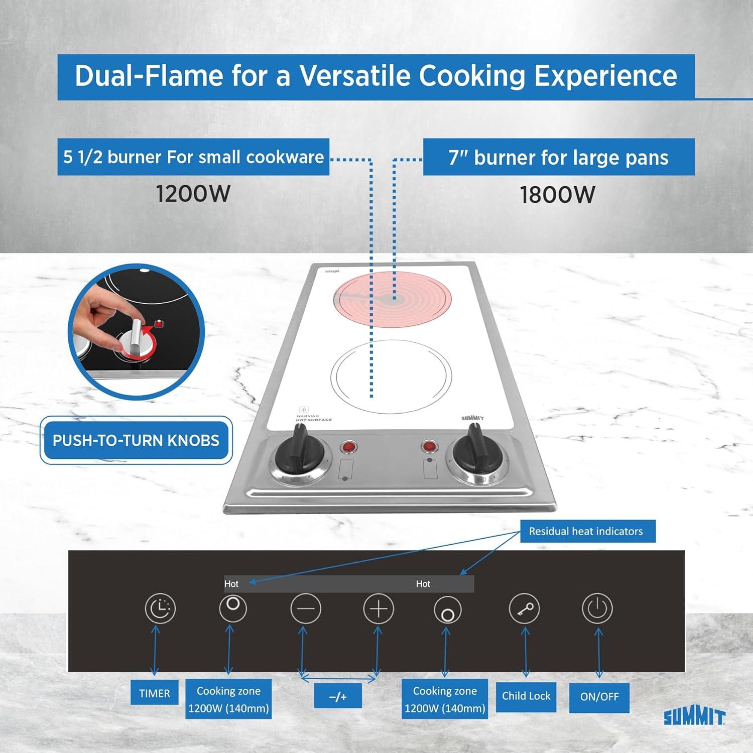 Summit CR2B120 12-inch Wide 115V 2-Burner Radiant Electric Cooktop, Jet Black Glass Easy to Clean, Two Burner Total 2400W, Push-to-Turn Knob Control, Indicator Light, Hot Warning, Easy Plug-In(White)