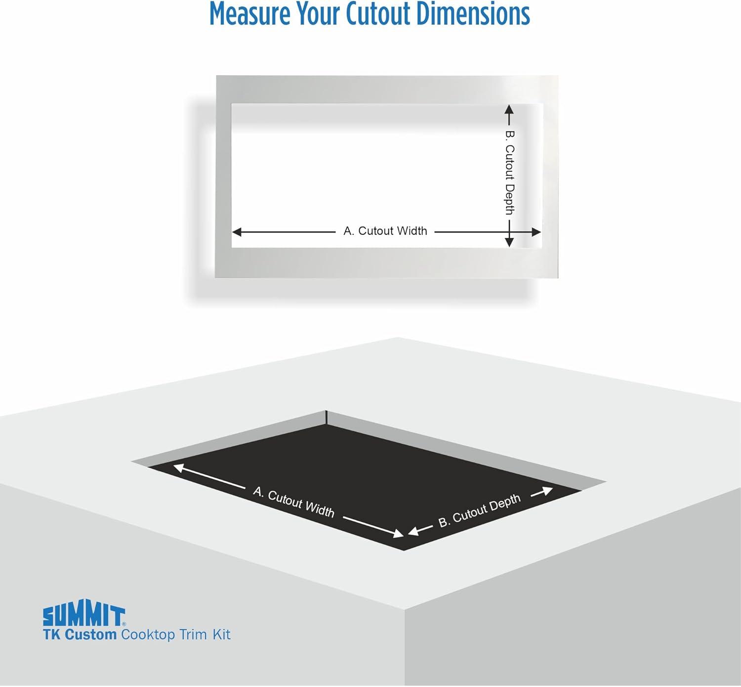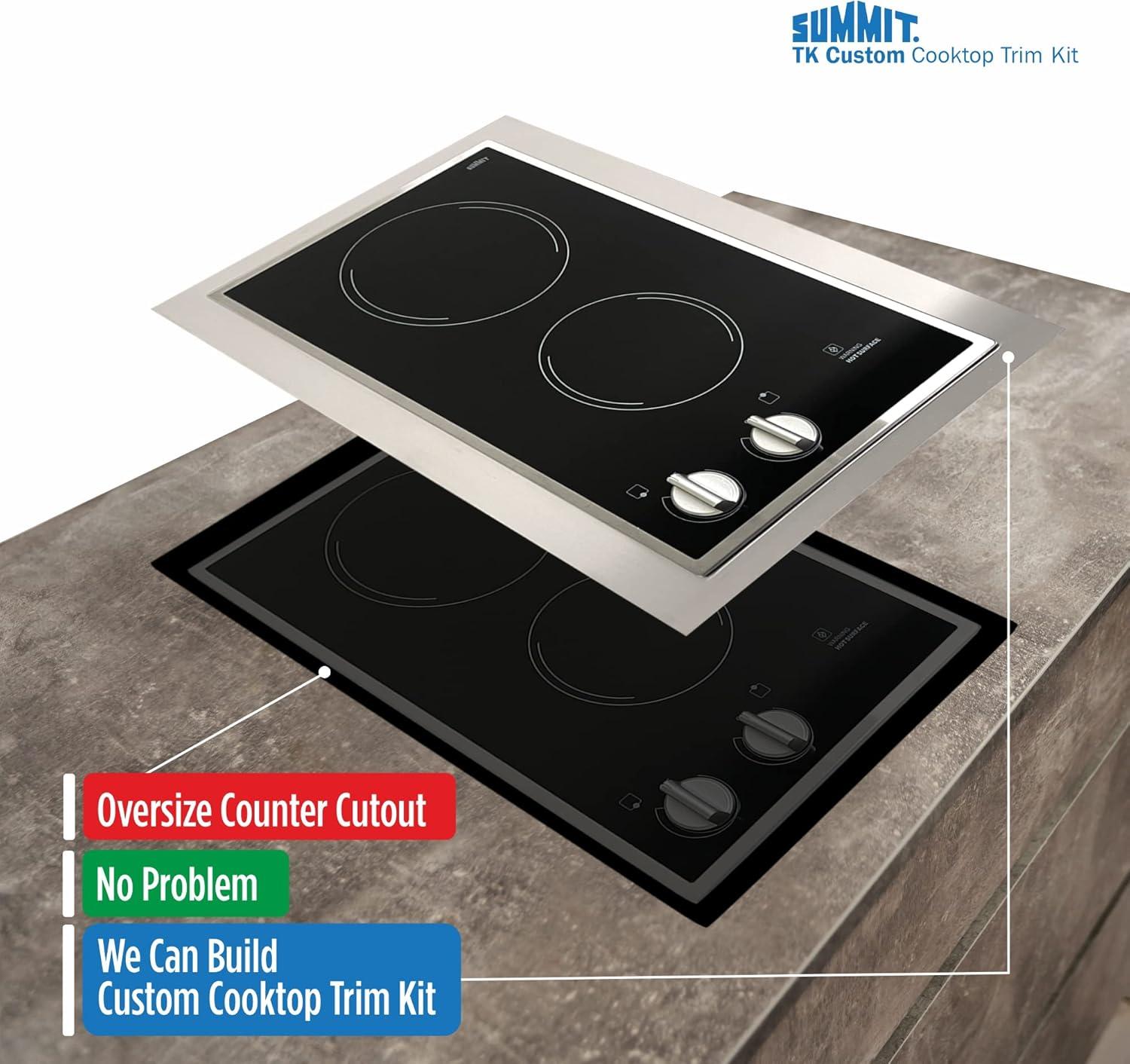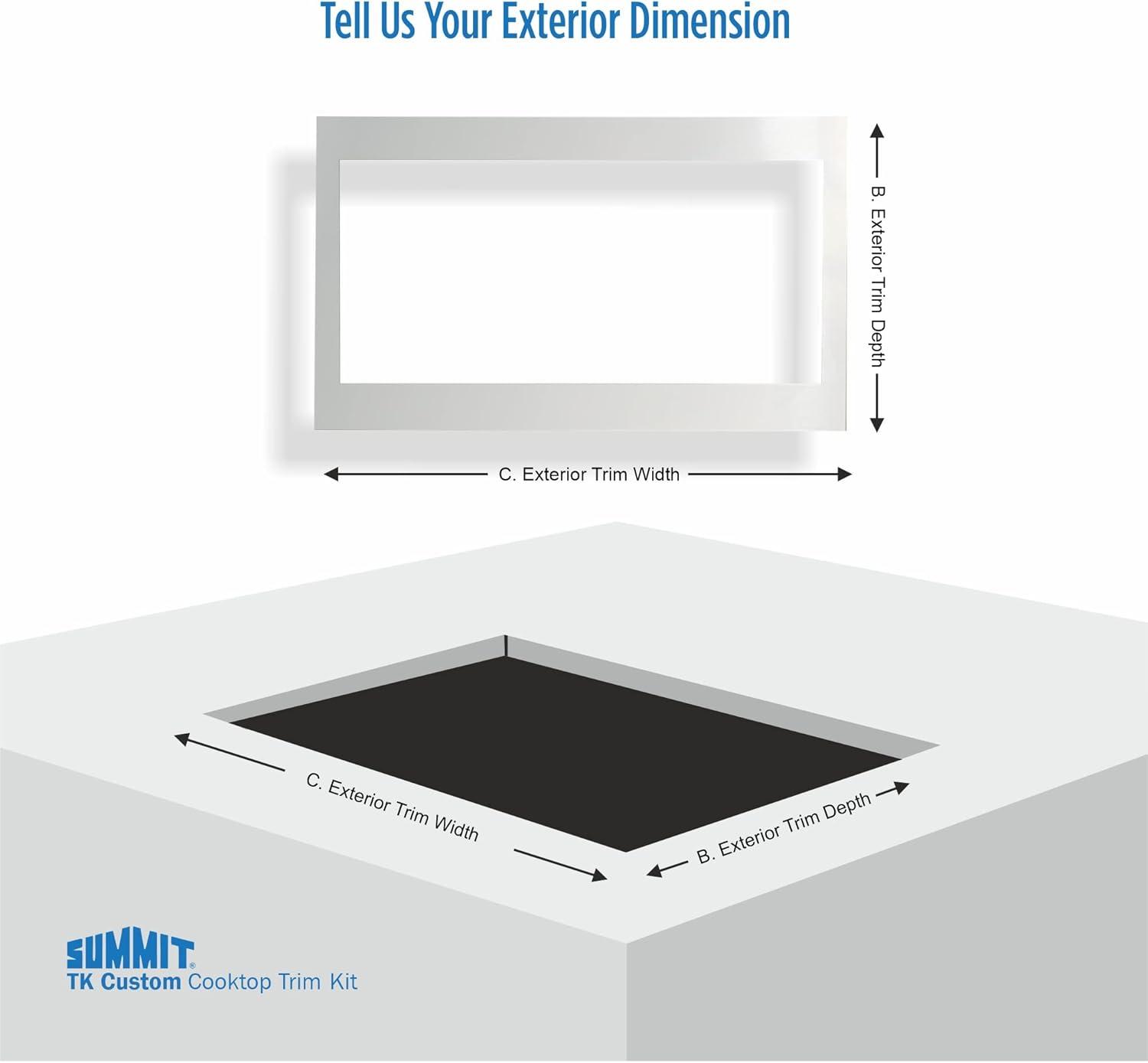 Custom Cooktop Trim Kit: We can build any size Cooktop Trim. Simply tell us the overall size of your cutout and how large you want your trim kit to be, and we will custom-build a collar that allows you to install your cooktop without the added expense of modifying or re-tiling your existing counter. Our custom trim kits can be built to be compatible with any cooktop brand, including all our Summit Cooktops. Our Cooktop Trim Kits are used when installing almost any desired cooktop into an oversized, existing countertop opening.