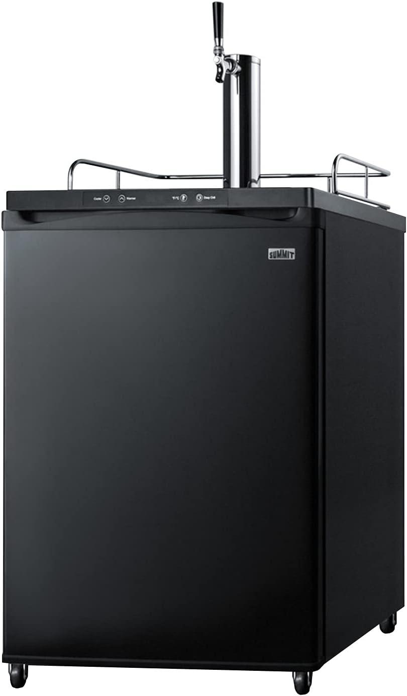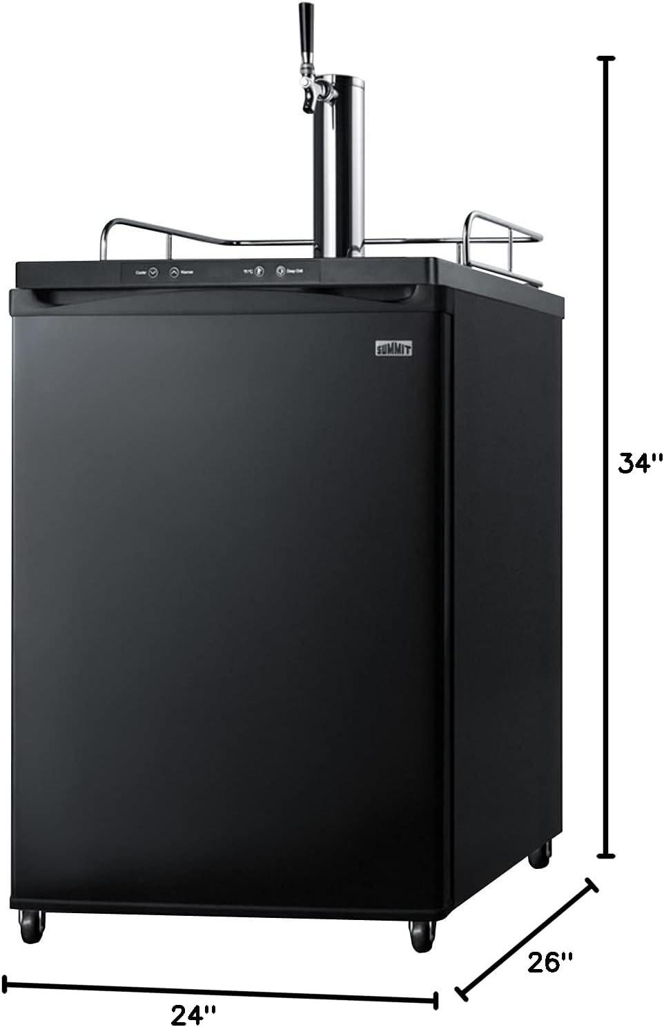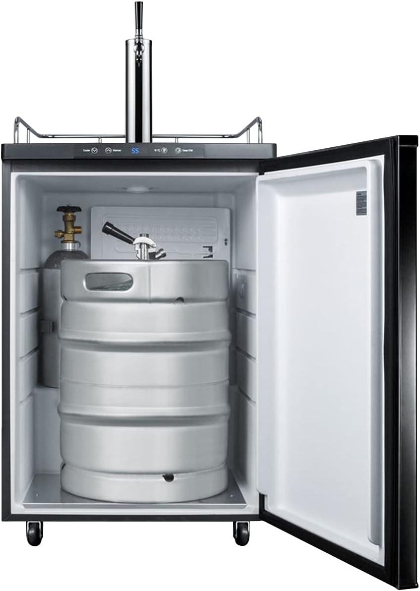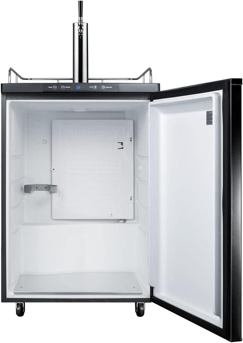 The SBC635MBI features a large interior that can hold a full half, quarter, 1/6 or mini keg. It features a front-breathing design for built-in installation under counters, with a jet black finish and matching Sankey tower. The surface includes a removable drip tray to collect spills and a chrome guard rail to help keep glasses and mugs in place. The user-reversible door swing makes it easy to accommodate any location’s setup. This unit is height adjustable from 33 1/2″ to 34″ to best fit your under counter space. Please note that the door does not open in its own radius. When planning your cutout, if the unit is mounted against a wall or flush under cabinetry, you will need between 25 and 25 1/4″ width for proper ventilation.