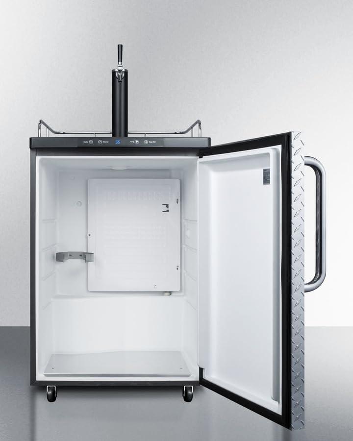 The SBC635MDPL features a large interior that can hold a full half, quarter, 1/6 or mini keg. It comes in a jet black cabinet with a matching Sankey tower. The surface includes a removable drip tray to collect spills and a chrome guard rail to help keep glasses and mugs in place. We include a set of locking casters for easy mobility. This unit features a textured diamond plate wrapped door in aluminum with a polished towel bar handle to create a unique industrial look.