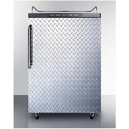 The SBC635MNKDPL features a large interior that can hold a full half, quarter, 1/6 or mini keg. No tapping equipment is included, allowing 'do-it-yourselfers' to customize the unit with their own system. It comes with a black cabinet and surface. The aluminum door features a unique textured diamond plate design for an industrial look, with a curved towel bar handle in polished stainless steel. The surface includes a removable drip tray to collect spills and a chrome guard rail to help keep glasses and mugs in place. We include a set of locking casters for easy mobility.