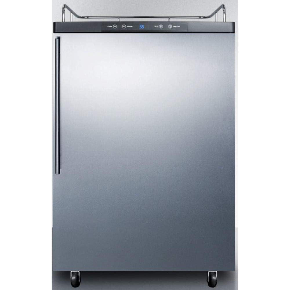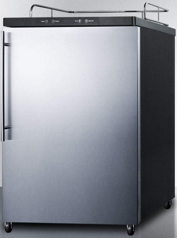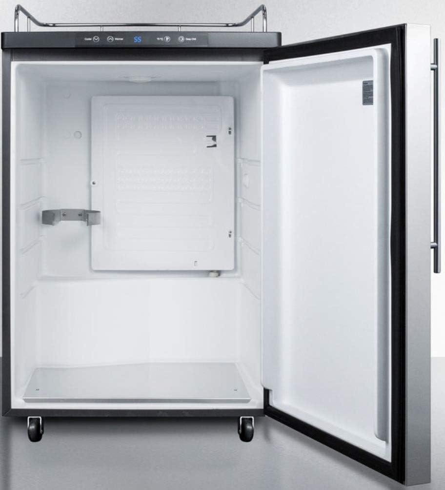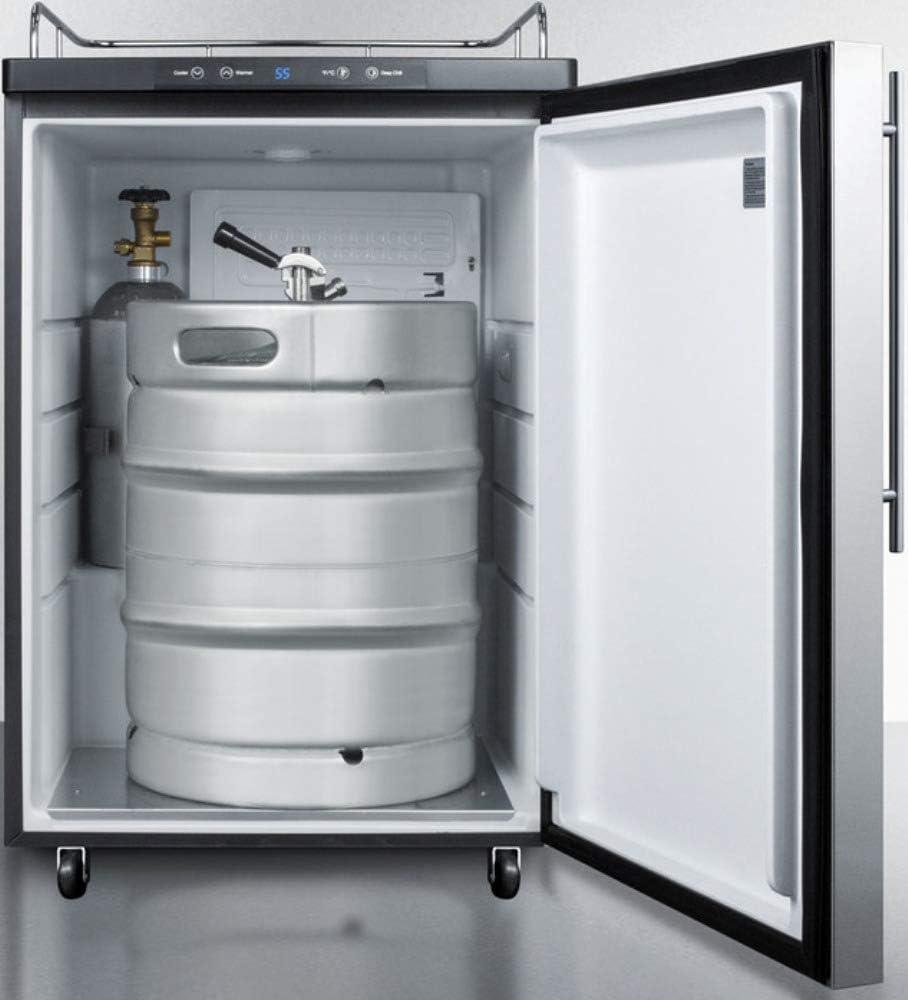 The SBC635MNKSSHV features a large interior that can hold a full half, quarter, 1/6 or mini keg. No tapping equipment is included, allowing 'do-it-yourselfers' to customize the unit with their own system. It comes with a black cabinet and stainless steel wrapped door complete with a professional style handle. The surface includes a removable drip tray to collect spills and a chrome guard rail to help keep glasses and mugs in place. We include a set of locking casters for easy mobility.